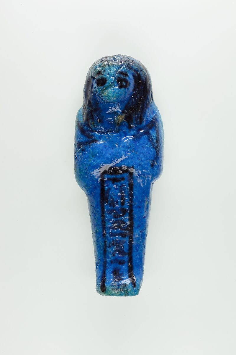 Almost 400 small funerary figures known as shabtis were found with Nauny’s burial. These can be seen as avatars, meant to carry out agricultural labor on Nauny’s behalf in the afterlife. Of the 393 shabtis discovered, 355 were workers like this one, and 37 were overseers (see for example <a href="https://www.metmuseum.org/art/collection/search/551114">30.3.28.3</a>). Based on other assemblages from this era, Nauny originally might have had a total of 365 workers, one for each day of the year. This mummiform figure holds a hoe in each hand and has a basket on its back. The inscription on the front of the body calls Nauny an “illuminated Osiris.” This indicated that she had been transformed through the process of mummification and identified with the principal god of the dead, then reanimated by the light of the sun god as he traveled through the Netherworld each night. Nauny’s shabtis were divided between seven boxes. Five of these, with their shabtis, were given to The Met, while two were sent to the Egyptian Museum in Cairo.