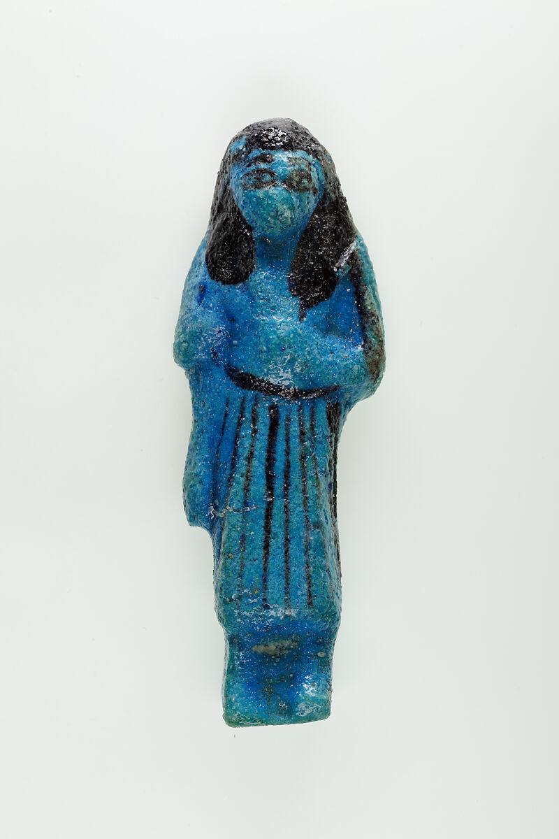 Almost 400 small funerary figures known as shabtis were found with Nauny’s burial. These can be seen as avatars, meant to carry out agricultural labor on Nauny’s behalf in the afterlife. Of the 393 shabtis discovered, 355 were workers and 37 were overseers like this one. Recognizable by their long kilts and the flails that they hold, the overseer figures were meant to supervise the worker shabtis (see for example <a href="https://www.metmuseum.org/art/collection/search/625679">30.3.26.10</a>) that worked on Nauny’s behalf in the afterlife. On the back pillar, Nauny is named as as a beloved king’s daughter and called an “illuminated Osiris,” transformed through the process of mummification and identified with the principal god of the dead, then reanimated by the light of the sun god as he traveled through the Netherworld each night. Nauny’s shabtis were divided between seven boxes. Five of these, with their shabtis, were given to The Met, while two were sent to the Egyptian Museum in Cairo.