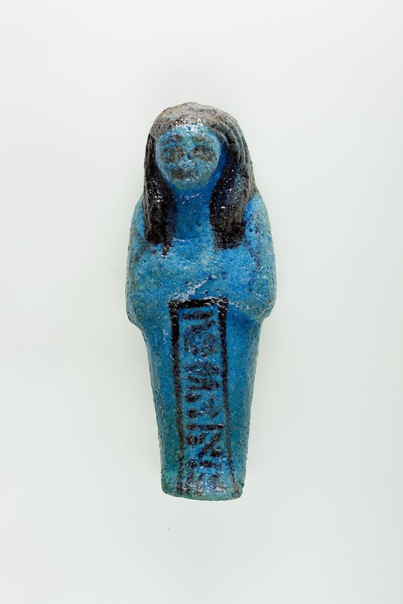 Almost 400 small funerary figures known as shabtis were found with Nauny’s burial. These can be seen as avatars, meant to carry out agricultural labor on Nauny’s behalf in the afterlife. Of the 393 shabtis discovered, 355 were workers like this one, and 37 were overseers (see for example <a href="https://www.metmuseum.org/art/collection/search/551114">30.3.28.3</a>). Based on other assemblages from this era, Nauny originally might have had a total of 365 workers, one for each day of the year. This mummiform figure holds a hoe in each hand and has a basket on its back. The inscription on the front of the body calls Nauny a King’s Daughter, and an “illuminated Osiris.” This indicated that she had been transformed through the process of mummification and identified with the principal god of the dead, then reanimated by the light of the sun god as he traveled through the Netherworld each night. Nauny’s shabtis were divided between seven boxes. Five of these, with their shabtis, were given to The Met, while two were sent to the Egyptian Museum in Cairo.