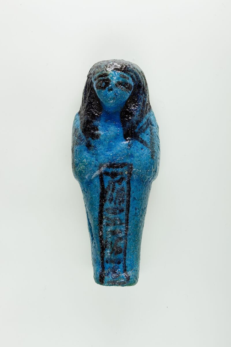 Almost 400 small funerary figures known as shabtis were found with Nauny’s burial. These can be seen as avatars, meant to carry out agricultural labor on Nauny’s behalf in the afterlife. Of the 393 shabtis discovered, 355 were workers like this one, and 37 were overseers (see for example <a href="https://www.metmuseum.org/art/collection/search/551114">30.3.28.3</a>). Based on other assemblages from this era, Nauny originally might have had a total of 365 workers, one for each day of the year. This mummiform figure holds a hoe in each hand and has a basket on its back. The inscription on the front of the body calls Nauny an “illuminated Osiris.” This indicated that she had been transformed through the process of mummification and identified with the principal god of the dead, then reanimated by the light of the sun god as he traveled through the Netherworld each night. Nauny’s shabtis were divided between seven boxes. Five of these, with their shabtis, were given to The Met, while two were sent to the Egyptian Museum in Cairo.