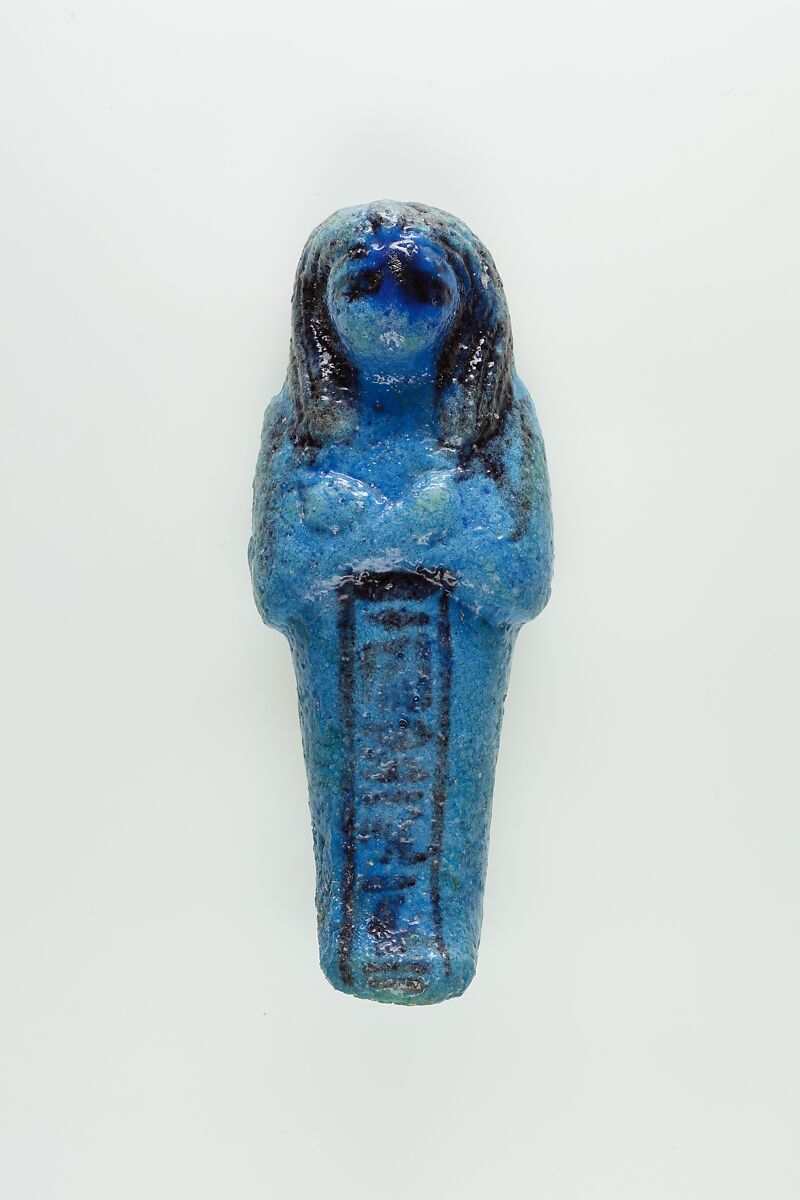 Almost 400 small funerary figures known as shabtis were found with Nauny’s burial. These can be seen as avatars, meant to carry out agricultural labor on Nauny’s behalf in the afterlife. Of the 393 shabtis discovered, 355 were workers like this one, and 37 were overseers (see for example <a href="https://www.metmuseum.org/art/collection/search/551114">30.3.28.3</a>). Based on other assemblages from this era, Nauny originally might have had a total of 365 workers, one for each day of the year. This mummiform figure holds a hoe in each hand and has a basket on its back. The inscription on the front of the body calls Nauny an “illuminated Osiris.” This indicated that she had been transformed through the process of mummification and identified with the principal god of the dead, then reanimated by the light of the sun god as he traveled through the Netherworld each night. Nauny’s shabtis were divided between seven boxes. Five of these, with their shabtis, were given to The Met, while two were sent to the Egyptian Museum in Cairo.