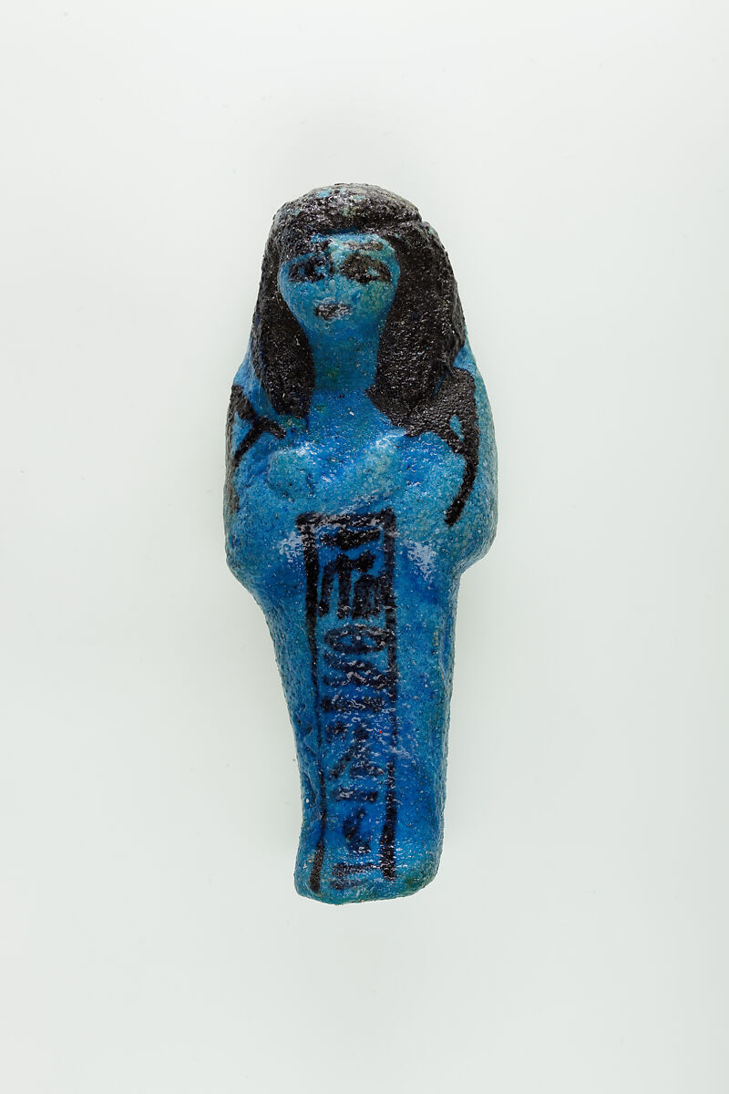 Almost 400 small funerary figures known as shabtis were found with Nauny’s burial. These can be seen as avatars, meant to carry out agricultural labor on Nauny’s behalf in the afterlife. Of the 393 shabtis discovered, 355 were workers like this one, and 37 were overseers (see for example <a href="https://www.metmuseum.org/art/collection/search/551114">30.3.28.3</a>). Based on other assemblages from this era, Nauny originally might have had a total of 365 workers, one for each day of the year. This mummiform figure holds a hoe in each hand and has a basket on its back. The inscription on the front of the body calls Nauny an “illuminated Osiris.” This indicated that she had been transformed through the process of mummification and identified with the principal god of the dead, then reanimated by the light of the sun god as he traveled through the Netherworld each night. Nauny’s shabtis were divided between seven boxes. Five of these, with their shabtis, were given to The Met, while two were sent to the Egyptian Museum in Cairo.