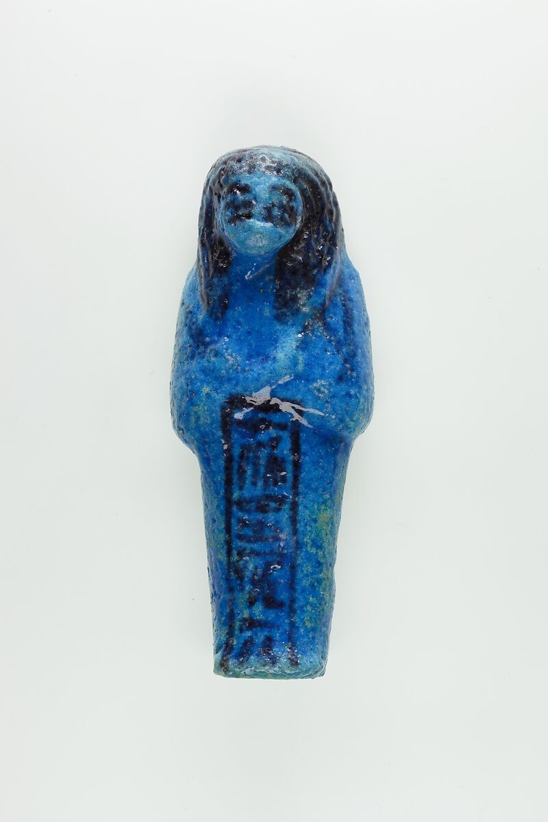 Almost 400 small funerary figures known as shabtis were found with Nauny’s burial. These can be seen as avatars, meant to carry out agricultural labor on Nauny’s behalf in the afterlife. Of the 393 shabtis discovered, 355 were workers like this one, and 37 were overseers (see for example <a href="https://www.metmuseum.org/art/collection/search/551114">30.3.28.3</a>). Based on other assemblages from this era, Nauny originally might have had a total of 365 workers, one for each day of the year. This mummiform figure holds a hoe in each hand and has a basket on its back. The inscription on the front of the body calls Nauny an “illuminated Osiris.” This indicated that she had been transformed through the process of mummification and identified with the principal god of the dead, then reanimated by the light of the sun god as he traveled through the Netherworld each night. Nauny’s shabtis were divided between seven boxes. Five of these, with their shabtis, were given to The Met, while two were sent to the Egyptian Museum in Cairo.