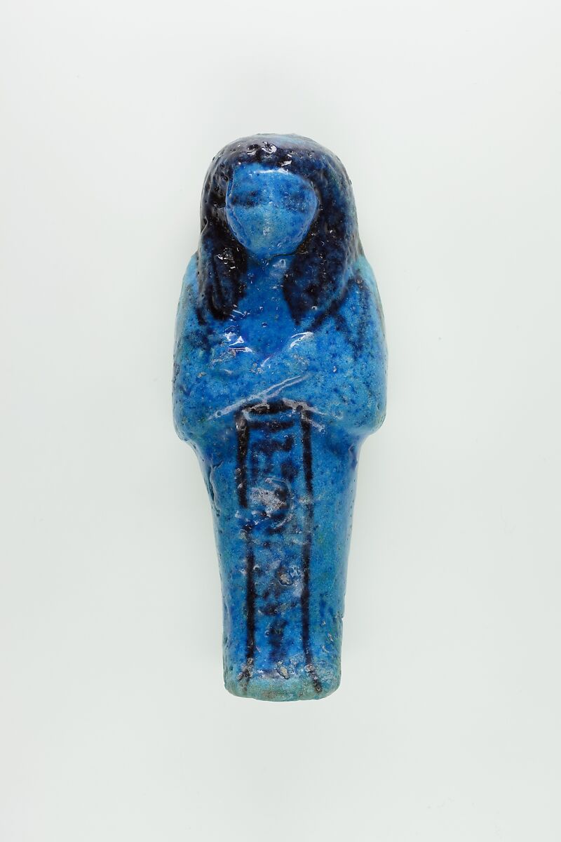 Almost 400 small funerary figures known as shabtis were found with Nauny’s burial. These can be seen as avatars, meant to carry out agricultural labor on Nauny’s behalf in the afterlife. Of the 393 shabtis discovered, 355 were workers like this one, and 37 were overseers (see for example <a href="https://www.metmuseum.org/art/collection/search/551114">30.3.28.3</a>). Based on other assemblages from this era, Nauny originally might have had a total of 365 workers, one for each day of the year. This mummiform figure holds a hoe in each hand and has a basket on its back. The inscription on the front of the body calls Nauny an “illuminated Osiris.” This indicated that she had been transformed through the process of mummification and identified with the principal god of the dead, then reanimated by the light of the sun god as he traveled through the Netherworld each night. Nauny’s shabtis were divided between seven boxes. Five of these, with their shabtis, were given to The Met, while two were sent to the Egyptian Museum in Cairo.