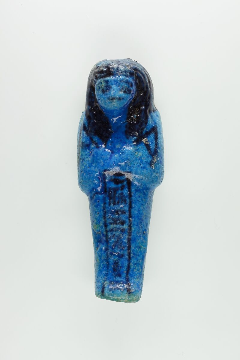 Almost 400 small funerary figures known as shabtis were found with Nauny’s burial. These can be seen as avatars, meant to carry out agricultural labor on Nauny’s behalf in the afterlife. Of the 393 shabtis discovered, 355 were workers like this one, and 37 were overseers (see for example <a href="https://www.metmuseum.org/art/collection/search/551114">30.3.28.3</a>). Based on other assemblages from this era, Nauny originally might have had a total of 365 workers, one for each day of the year. This mummiform figure holds a hoe in each hand and has a basket on its back. The inscription on the front of the body calls Nauny an “illuminated Osiris.” This indicated that she had been transformed through the process of mummification and identified with the principal god of the dead, then reanimated by the light of the sun god as he traveled through the Netherworld each night. Nauny’s shabtis were divided between seven boxes. Five of these, with their shabtis, were given to The Met, while two were sent to the Egyptian Museum in Cairo.