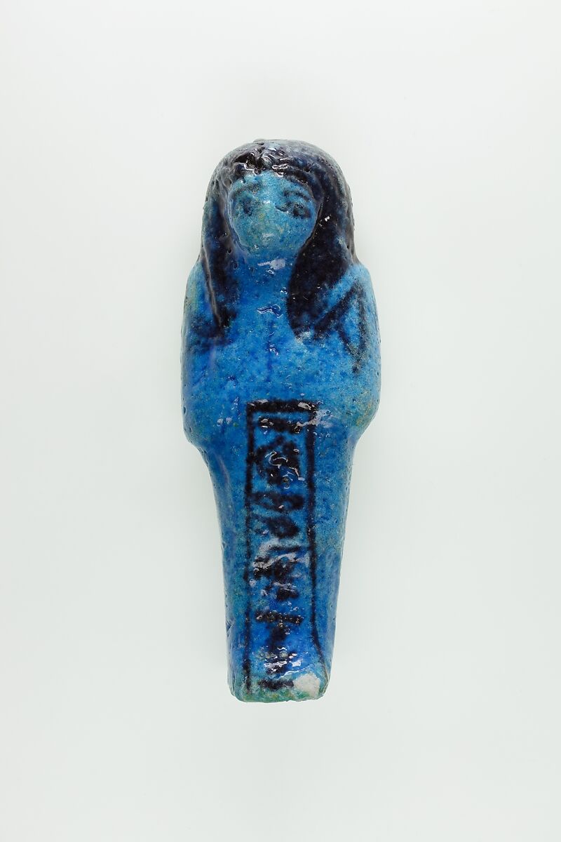 Almost 400 small funerary figures known as shabtis were found with Nauny’s burial. These can be seen as avatars, meant to carry out agricultural labor on Nauny’s behalf in the afterlife. Of the 393 shabtis discovered, 355 were workers like this one, and 37 were overseers (see for example <a href="https://www.metmuseum.org/art/collection/search/551114">30.3.28.3</a>). Based on other assemblages from this era, Nauny originally might have had a total of 365 workers, one for each day of the year. This mummiform figure holds a hoe in each hand and has a basket on its back. The inscription on the front of the body calls Nauny an “illuminated Osiris.” This indicated that she had been transformed through the process of mummification and identified with the principal god of the dead, then reanimated by the light of the sun god as he traveled through the Netherworld each night. Nauny’s shabtis were divided between seven boxes. Five of these, with their shabtis, were given to The Met, while two were sent to the Egyptian Museum in Cairo.