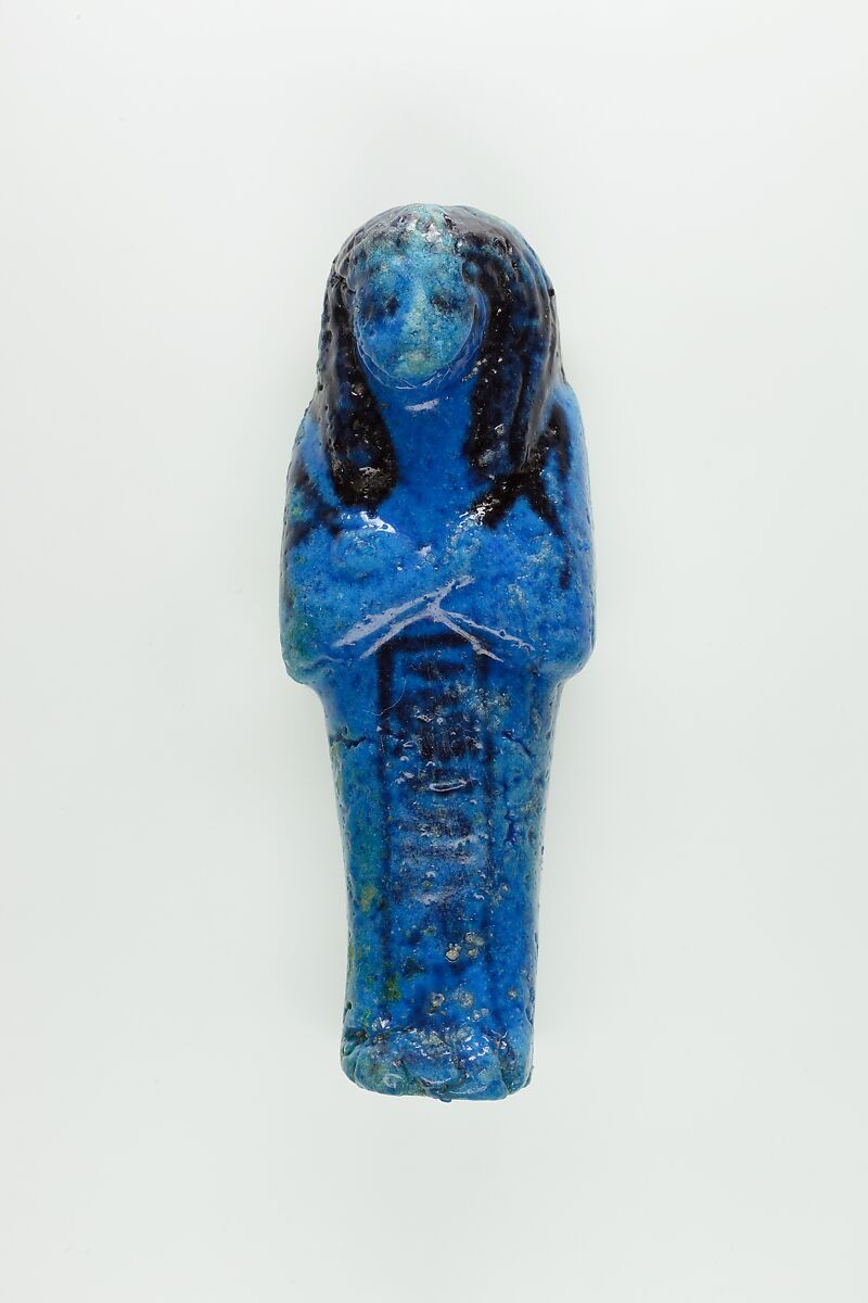 Almost 400 small funerary figures known as shabtis were found with Nauny’s burial. These can be seen as avatars, meant to carry out agricultural labor on Nauny’s behalf in the afterlife. Of the 393 shabtis discovered, 355 were workers like this one, and 37 were overseers (see for example <a href="https://www.metmuseum.org/art/collection/search/551114">30.3.28.3</a>). Based on other assemblages from this era, Nauny originally might have had a total of 365 workers, one for each day of the year. This mummiform figure holds a hoe in each hand and has a basket on its back. The inscription on the front of the body calls Nauny an “illuminated Osiris.” This indicated that she had been transformed through the process of mummification and identified with the principal god of the dead, then reanimated by the light of the sun god as he traveled through the Netherworld each night. Nauny’s shabtis were divided between seven boxes. Five of these, with their shabtis, were given to The Met, while two were sent to the Egyptian Museum in Cairo.