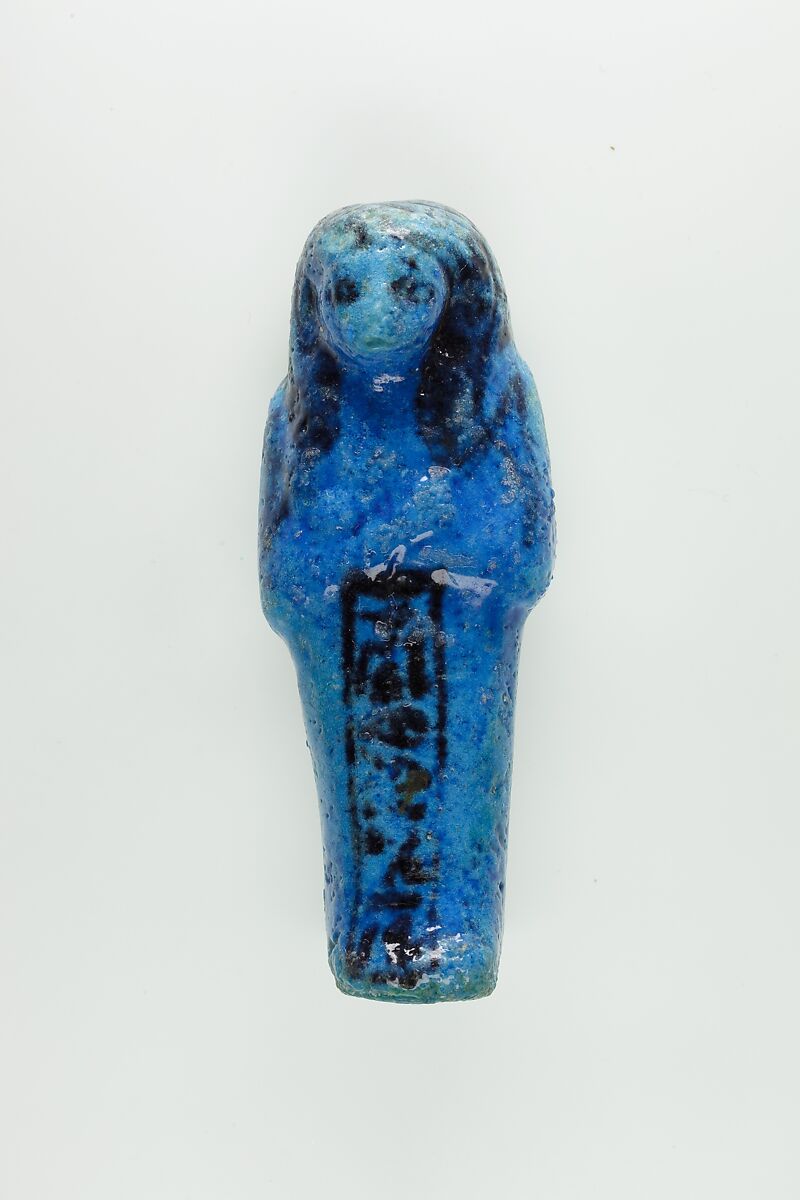Almost 400 small funerary figures known as shabtis were found with Nauny’s burial. These can be seen as avatars, meant to carry out agricultural labor on Nauny’s behalf in the afterlife. Of the 393 shabtis discovered, 355 were workers like this one, and 37 were overseers (see for example <a href="https://www.metmuseum.org/art/collection/search/551114">30.3.28.3</a>). Based on other assemblages from this era, Nauny originally might have had a total of 365 workers, one for each day of the year. This mummiform figure holds a hoe in each hand and has a basket on its back. The inscription on the front of the body calls Nauny an “illuminated Osiris.” This indicated that she had been transformed through the process of mummification and identified with the principal god of the dead, then reanimated by the light of the sun god as he traveled through the Netherworld each night. Nauny’s shabtis were divided between seven boxes. Five of these, with their shabtis, were given to The Met, while two were sent to the Egyptian Museum in Cairo.