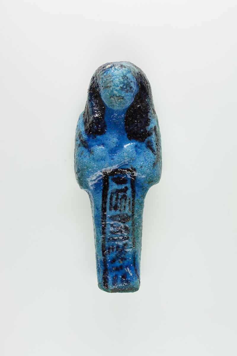 Almost 400 small funerary figures known as shabtis were found with Nauny’s burial. These can be seen as avatars, meant to carry out agricultural labor on Nauny’s behalf in the afterlife. Of the 393 shabtis discovered, 355 were workers like this one, and 37 were overseers (see for example <a href="https://www.metmuseum.org/art/collection/search/551114">30.3.28.3</a>). Based on other assemblages from this era, Nauny originally might have had a total of 365 workers, one for each day of the year. This mummiform figure holds a hoe in each hand and has a basket on its back. The inscription on the front of the body calls Nauny an “illuminated Osiris.” This indicated that she had been transformed through the process of mummification and identified with the principal god of the dead, then reanimated by the light of the sun god as he traveled through the Netherworld each night. Nauny’s shabtis were divided between seven boxes. Five of these, with their shabtis, were given to The Met, while two were sent to the Egyptian Museum in Cairo.