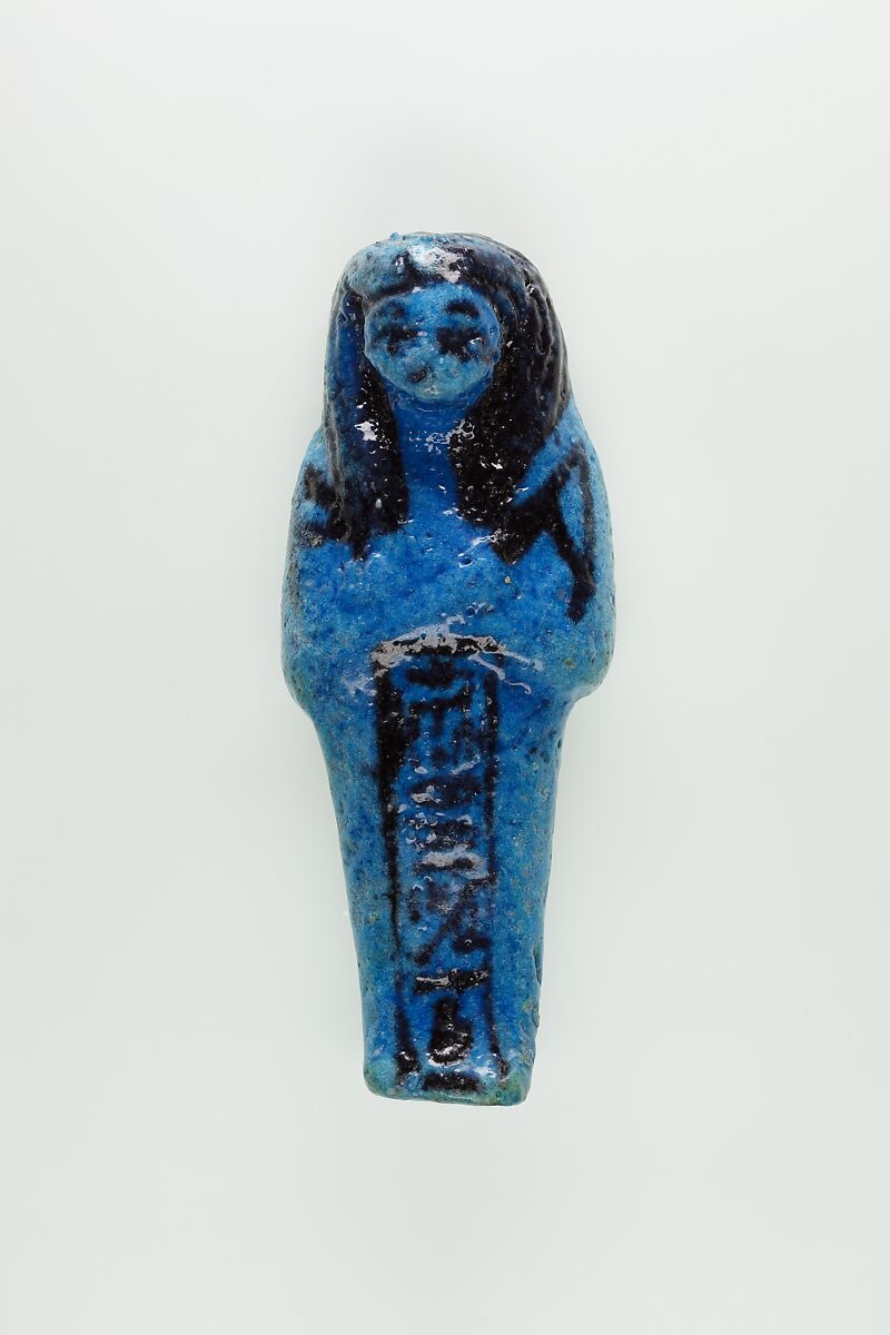Almost 400 small funerary figures known as shabtis were found with Nauny’s burial. These can be seen as avatars, meant to carry out agricultural labor on Nauny’s behalf in the afterlife. Of the 393 shabtis discovered, 355 were workers like this one, and 37 were overseers (see for example <a href="https://www.metmuseum.org/art/collection/search/551114">30.3.28.3</a>). Based on other assemblages from this era, Nauny originally might have had a total of 365 workers, one for each day of the year. This mummiform figure holds a hoe in each hand and has a basket on its back. The inscription on the front of the body calls Nauny an “illuminated Osiris.” This indicated that she had been transformed through the process of mummification and identified with the principal god of the dead, then reanimated by the light of the sun god as he traveled through the Netherworld each night. Nauny’s shabtis were divided between seven boxes. Five of these, with their shabtis, were given to The Met, while two were sent to the Egyptian Museum in Cairo.