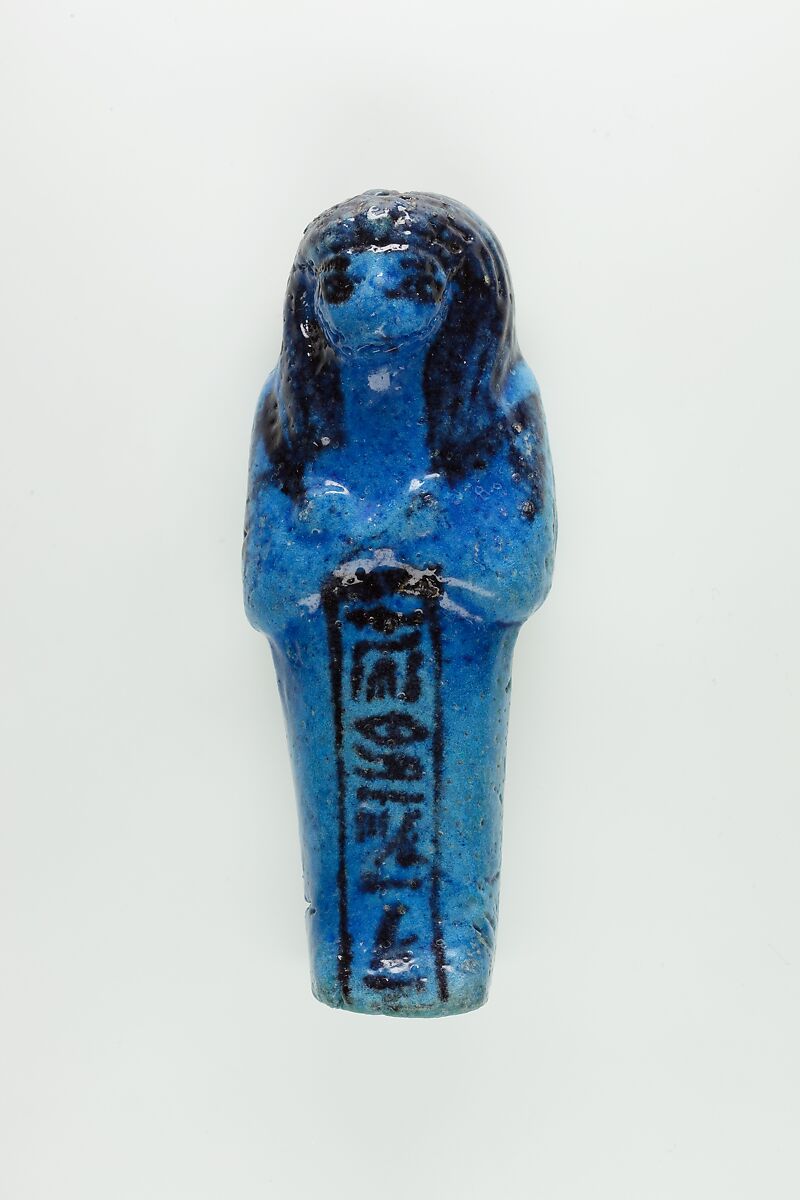 Almost 400 small funerary figures known as shabtis were found with Nauny’s burial. These can be seen as avatars, meant to carry out agricultural labor on Nauny’s behalf in the afterlife. Of the 393 shabtis discovered, 355 were workers like this one, and 37 were overseers (see for example <a href="https://www.metmuseum.org/art/collection/search/551114">30.3.28.3</a>). Based on other assemblages from this era, Nauny originally might have had a total of 365 workers, one for each day of the year. This mummiform figure holds a hoe in each hand and has a basket on its back. The inscription on the front of the body calls Nauny an “illuminated Osiris.” This indicated that she had been transformed through the process of mummification and identified with the principal god of the dead, then reanimated by the light of the sun god as he traveled through the Netherworld each night. Nauny’s shabtis were divided between seven boxes. Five of these, with their shabtis, were given to The Met, while two were sent to the Egyptian Museum in Cairo.