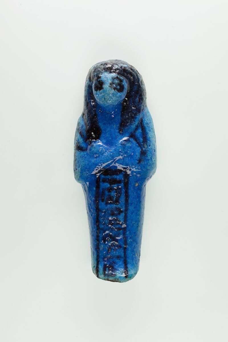 Almost 400 small funerary figures known as shabtis were found with Nauny’s burial. These can be seen as avatars, meant to carry out agricultural labor on Nauny’s behalf in the afterlife. Of the 393 shabtis discovered, 355 were workers like this one, and 37 were overseers (see for example <a href="https://www.metmuseum.org/art/collection/search/551114">30.3.28.3</a>). Based on other assemblages from this era, Nauny originally might have had a total of 365 workers, one for each day of the year. This mummiform figure holds a hoe in each hand and has a basket on its back. The inscription on the front of the body calls Nauny an “illuminated Osiris.” This indicated that she had been transformed through the process of mummification and identified with the principal god of the dead, then reanimated by the light of the sun god as he traveled through the Netherworld each night. Nauny’s shabtis were divided between seven boxes. Five of these, with their shabtis, were given to The Met, while two were sent to the Egyptian Museum in Cairo.