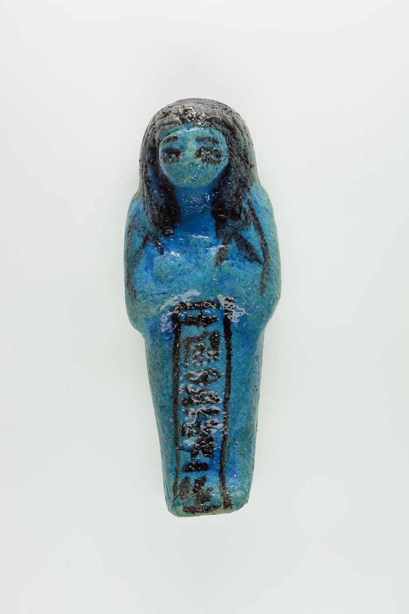 Almost 400 small funerary figures known as shabtis were found with Nauny’s burial. These can be seen as avatars, meant to carry out agricultural labor on Nauny’s behalf in the afterlife. Of the 393 shabtis discovered, 355 were workers like this one, and 37 were overseers (see for example <a href="https://www.metmuseum.org/art/collection/search/551114">30.3.28.3</a>). Based on other assemblages from this era, Nauny originally might have had a total of 365 workers, one for each day of the year. This mummiform figure holds a hoe in each hand and has a basket on its back. The inscription on the front of the body calls Nauny an “illuminated Osiris.” This indicated that she had been transformed through the process of mummification and identified with the principal god of the dead, then reanimated by the light of the sun god as he traveled through the Netherworld each night. Nauny’s shabtis were divided between seven boxes. Five of these, with their shabtis, were given to The Met, while two were sent to the Egyptian Museum in Cairo.