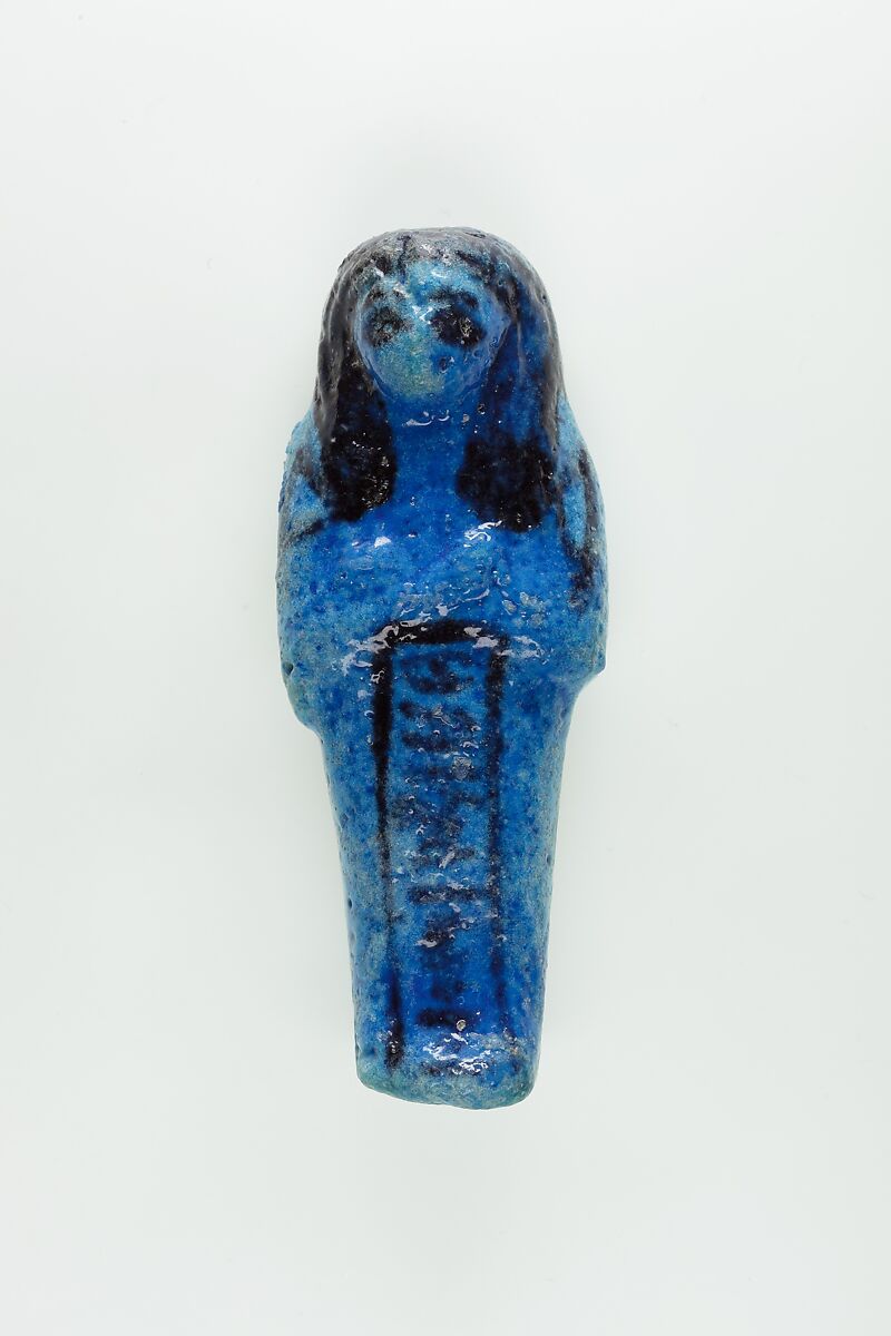 Almost 400 small funerary figures known as shabtis were found with Nauny’s burial. These can be seen as avatars, meant to carry out agricultural labor on Nauny’s behalf in the afterlife. Of the 393 shabtis discovered, 355 were workers like this one, and 37 were overseers (see for example <a href="https://www.metmuseum.org/art/collection/search/551114">30.3.28.3</a>). Based on other assemblages from this era, Nauny originally might have had a total of 365 workers, one for each day of the year. This mummiform figure holds a hoe in each hand and has a basket on its back. The inscription on the front of the body reads, "the Osiris Nauny, true of voice." This indicated that Nauny had been transformed through the process of mummification and identified with the principal god of the dead, and then had been judged to have led an ethical life. Nauny’s shabtis were divided between seven boxes. Five of these, with their shabtis, were given to The Met, while two were sent to the Egyptian Museum in Cairo.