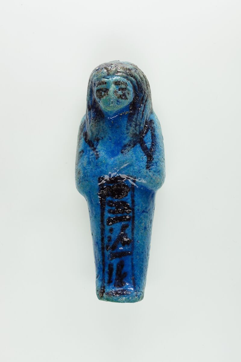 Almost 400 small funerary figures known as shabtis were found with Nauny’s burial. These can be seen as avatars, meant to carry out agricultural labor on Nauny’s behalf in the afterlife. Of the 393 shabtis discovered, 355 were workers like this one, and 37 were overseers (see for example <a href="https://www.metmuseum.org/art/collection/search/551114">30.3.28.3</a>). Based on other assemblages from this era, Nauny originally might have had a total of 365 workers, one for each day of the year. This mummiform figure holds a hoe in each hand and has a basket on its back. The inscription on the front of the body reads, "the Osiris Nauny, true of voice." This indicated that Nauny had been transformed through the process of mummification and identified with the principal god of the dead, and then had been judged to have led an ethical life. Nauny’s shabtis were divided between seven boxes. Five of these, with their shabtis, were given to The Met, while two were sent to the Egyptian Museum in Cairo.