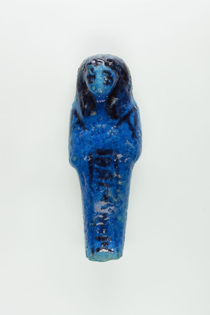 Almost 400 small funerary figures known as shabtis were found with Nauny’s burial. These can be seen as avatars, meant to carry out agricultural labor on Nauny’s behalf in the afterlife. Of the 393 shabtis discovered, 355 were workers like this one, and 37 were overseers (see for example <a href="https://www.metmuseum.org/art/collection/search/551114">30.3.28.3</a>). Based on other assemblages from this era, Nauny originally might have had a total of 365 workers, one for each day of the year. This mummiform figure holds a hoe in each hand and has a basket on its back. The inscription on the front of the body reads, "the Osiris Nauny, true of voice." This indicated that Nauny had been transformed through the process of mummification and identified with the principal god of the dead, and then had been judged to have led an ethical life. Nauny’s shabtis were divided between seven boxes. Five of these, with their shabtis, were given to The Met, while two were sent to the Egyptian Museum in Cairo.