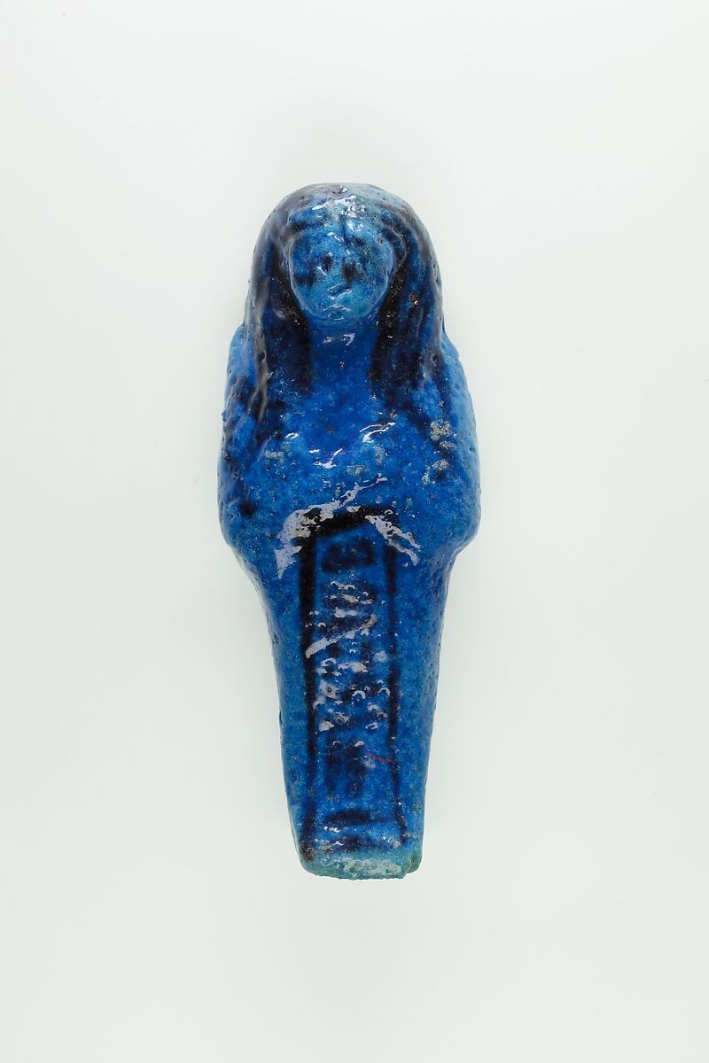 Almost 400 small funerary figures known as shabtis were found with Nauny’s burial. These can be seen as avatars, meant to carry out agricultural labor on Nauny’s behalf in the afterlife. Of the 393 shabtis discovered, 355 were workers like this one, and 37 were overseers (see for example <a href="https://www.metmuseum.org/art/collection/search/551114">30.3.28.3</a>). Based on other assemblages from this era, Nauny originally might have had a total of 365 workers, one for each day of the year. This mummiform figure holds a hoe in each hand and has a basket on its back. The inscription on the front of the body reads, "the Osiris Nauny, true of voice." This indicated that Nauny had been transformed through the process of mummification and identified with the principal god of the dead, and then had been judged to have led an ethical life. Nauny’s shabtis were divided between seven boxes. Five of these, with their shabtis, were given to The Met, while two were sent to the Egyptian Museum in Cairo.