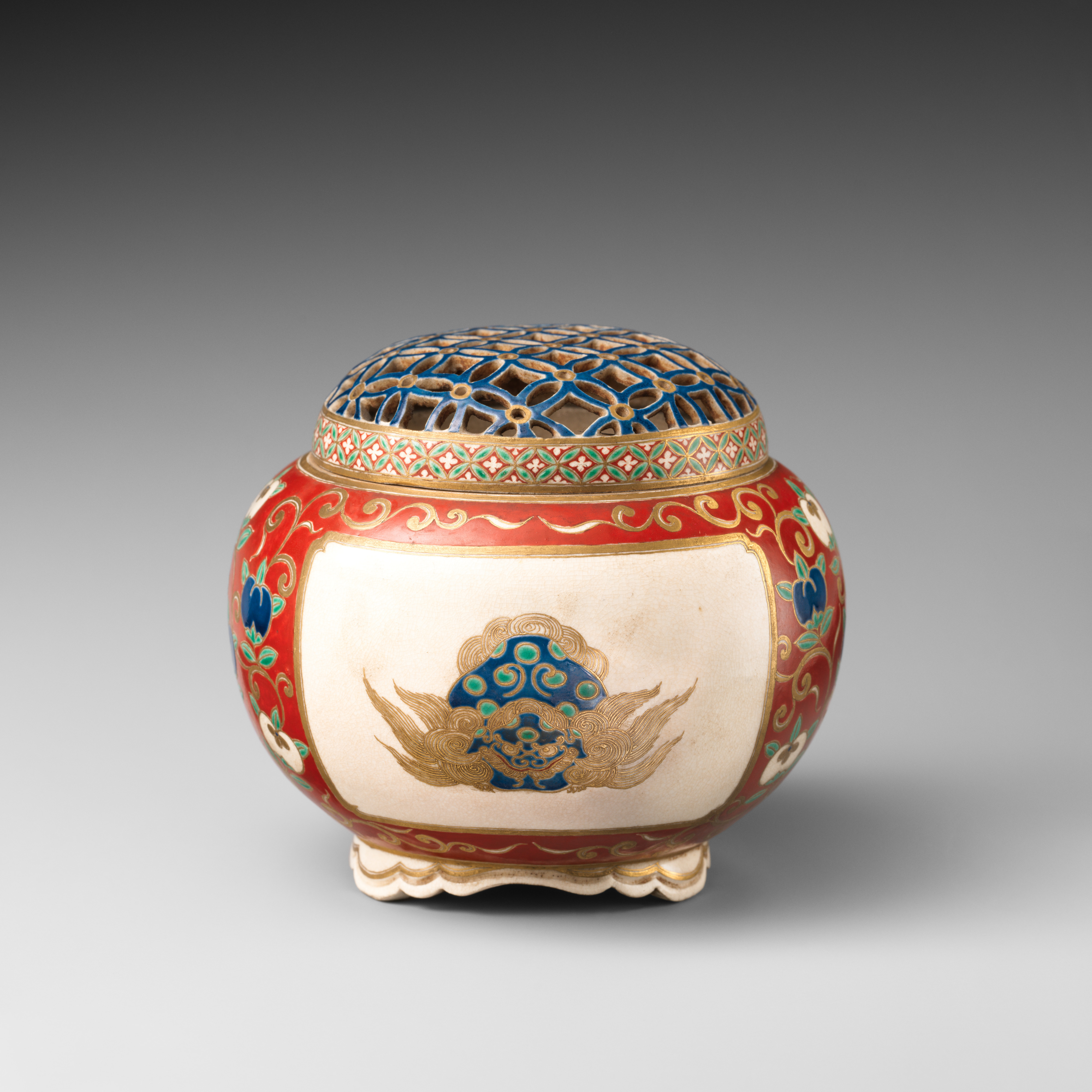 - Medium: Pottery covered with crackled glaze and designs in enamels and gold; reticulated cover, also enameled (Satsuma ware)