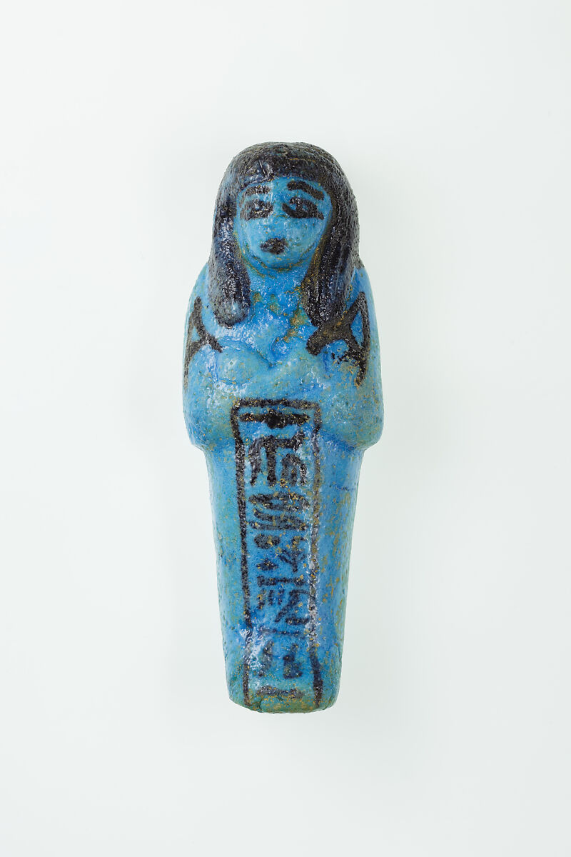 Almost 400 small funerary figures known as shabtis were found with Nauny’s burial. These can be seen as avatars, meant to carry out agricultural labor on Nauny’s behalf in the afterlife. Of the 393 shabtis discovered, 355 were workers like this one, and 37 were overseers (see for example <a href="https://www.metmuseum.org/art/collection/search/551114">30.3.28.3</a>). Based on other assemblages from this era, Nauny originally might have had a total of 365 workers, one for each day of the year. This mummiform figure holds a hoe in each hand and has a basket on its back. The inscription on the front of the body calls Nauny a King’s Daughter, and an “illuminated Osiris.” This indicated that she had been transformed through the process of mummification and identified with the principal god of the dead, then reanimated by the light of the sun god as he traveled through the Netherworld each night. Nauny’s shabtis were divided between seven boxes. Five of these, with their shabtis, were given to The Met, while two were sent to the Egyptian Museum in Cairo.