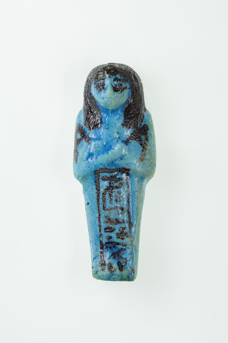 Almost 400 small funerary figures known as shabtis were found with Nauny’s burial. These can be seen as avatars, meant to carry out agricultural labor on Nauny’s behalf in the afterlife. Of the 393 shabtis discovered, 355 were workers like this one, and 37 were overseers (see for example <a href="https://www.metmuseum.org/art/collection/search/551114">30.3.28.3</a>). Based on other assemblages from this era, Nauny originally might have had a total of 365 workers, one for each day of the year. This mummiform figure holds a hoe in each hand and has a basket on its back. The inscription on the front of the body calls Nauny a King’s Daughter, and an “illuminated Osiris.” This indicated that she had been transformed through the process of mummification and identified with the principal god of the dead, then reanimated by the light of the sun god as he traveled through the Netherworld each night. Nauny’s shabtis were divided between seven boxes. Five of these, with their shabtis, were given to The Met, while two were sent to the Egyptian Museum in Cairo.