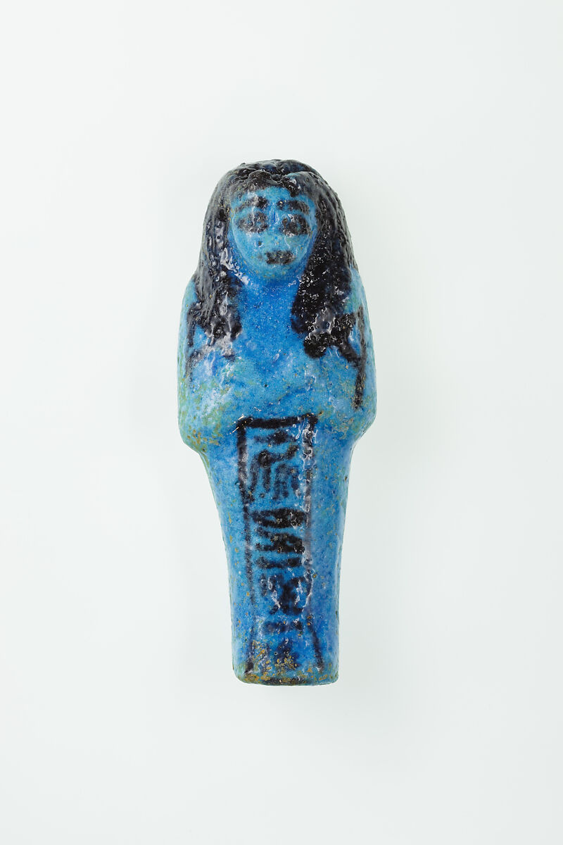 Almost 400 small funerary figures known as shabtis were found with Nauny’s burial. These can be seen as avatars, meant to carry out agricultural labor on Nauny’s behalf in the afterlife. Of the 393 shabtis discovered, 355 were workers like this one, and 37 were overseers (see for example <a href="https://www.metmuseum.org/art/collection/search/551114">30.3.28.3</a>). Based on other assemblages from this era, Nauny originally might have had a total of 365 workers, one for each day of the year. This mummiform figure holds a hoe in each hand and has a basket on its back. The inscription on the front of the body calls Nauny an “illuminated Osiris.” This indicated that she had been transformed through the process of mummification and identified with the principal god of the dead, then reanimated by the light of the sun god as he traveled through the Netherworld each night. Nauny’s shabtis were divided between seven boxes. Five of these, with their shabtis, were given to The Met, while two were sent to the Egyptian Museum in Cairo.