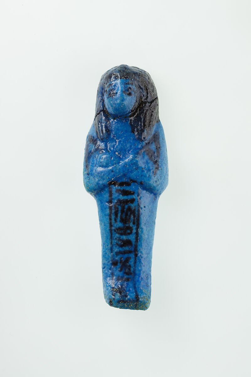 Almost 400 small funerary figures known as shabtis were found with Nauny’s burial. These can be seen as avatars, meant to carry out agricultural labor on Nauny’s behalf in the afterlife. Of the 393 shabtis discovered, 355 were workers like this one, and 37 were overseers (see for example <a href="https://www.metmuseum.org/art/collection/search/551114">30.3.28.3</a>). Based on other assemblages from this era, Nauny originally might have had a total of 365 workers, one for each day of the year. This mummiform figure holds a hoe in each hand and has a basket on its back. The inscription on the front of the body calls Nauny an “illuminated Osiris.” This indicated that she had been transformed through the process of mummification and identified with the principal god of the dead, then reanimated by the light of the sun god as he traveled through the Netherworld each night. Nauny’s shabtis were divided between seven boxes. Five of these, with their shabtis, were given to The Met, while two were sent to the Egyptian Museum in Cairo.