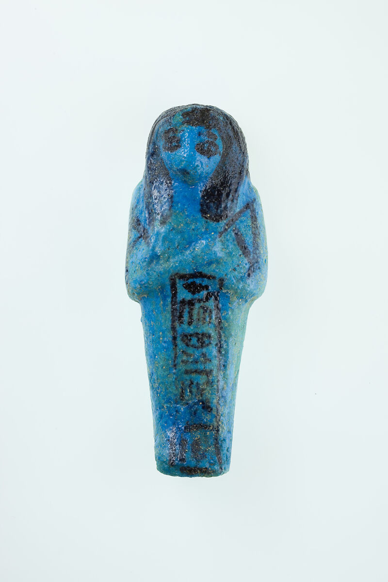 Almost 400 small funerary figures known as shabtis were found with Nauny’s burial. These can be seen as avatars, meant to carry out agricultural labor on Nauny’s behalf in the afterlife. Of the 393 shabtis discovered, 355 were workers like this one, and 37 were overseers (see for example <a href="https://www.metmuseum.org/art/collection/search/551114">30.3.28.3</a>). Based on other assemblages from this era, Nauny originally might have had a total of 365 workers, one for each day of the year. This mummiform figure holds a hoe in each hand and has a basket on its back. The inscription on the front of the body calls Nauny an “illuminated Osiris.” This indicated that she had been transformed through the process of mummification and identified with the principal god of the dead, then reanimated by the light of the sun god as he traveled through the Netherworld each night. Nauny’s shabtis were divided between seven boxes. Five of these, with their shabtis, were given to The Met, while two were sent to the Egyptian Museum in Cairo.
