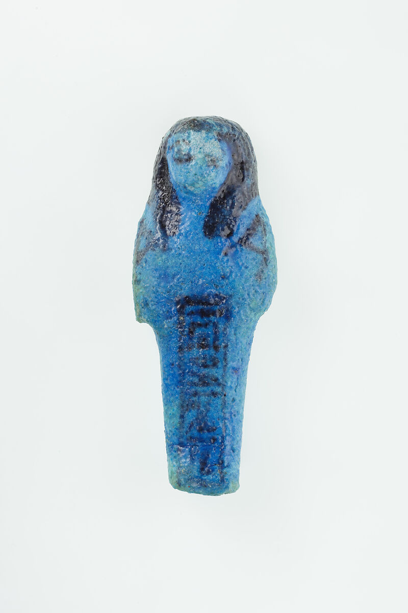 Almost 400 small funerary figures known as shabtis were found with Nauny’s burial. These can be seen as avatars, meant to carry out agricultural labor on Nauny’s behalf in the afterlife. Of the 393 shabtis discovered, 355 were workers like this one, and 37 were overseers (see for example <a href="https://www.metmuseum.org/art/collection/search/551114">30.3.28.3</a>). Based on other assemblages from this era, Nauny originally might have had a total of 365 workers, one for each day of the year. This mummiform figure holds a hoe in each hand and has a basket on its back. The inscription on the front of the body calls Nauny an “illuminated Osiris.” This indicated that she had been transformed through the process of mummification and identified with the principal god of the dead, then reanimated by the light of the sun god as he traveled through the Netherworld each night. Nauny’s shabtis were divided between seven boxes. Five of these, with their shabtis, were given to The Met, while two were sent to the Egyptian Museum in Cairo.