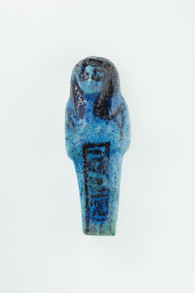 Almost 400 small funerary figures known as shabtis were found with Nauny’s burial. These can be seen as avatars, meant to carry out agricultural labor on Nauny’s behalf in the afterlife. Of the 393 shabtis discovered, 355 were workers like this one, and 37 were overseers (see for example <a href="https://www.metmuseum.org/art/collection/search/551114">30.3.28.3</a>). Based on other assemblages from this era, Nauny originally might have had a total of 365 workers, one for each day of the year. This mummiform figure holds a hoe in each hand and has a basket on its back. The inscription on the front of the body calls Nauny an “illuminated Osiris.” This indicated that she had been transformed through the process of mummification and identified with the principal god of the dead, then reanimated by the light of the sun god as he traveled through the Netherworld each night. Nauny’s shabtis were divided between seven boxes. Five of these, with their shabtis, were given to The Met, while two were sent to the Egyptian Museum in Cairo.