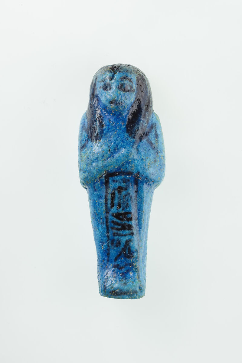 Almost 400 small funerary figures known as shabtis were found with Nauny’s burial. These can be seen as avatars, meant to carry out agricultural labor on Nauny’s behalf in the afterlife. Of the 393 shabtis discovered, 355 were workers like this one, and 37 were overseers (see for example <a href="https://www.metmuseum.org/art/collection/search/551114">30.3.28.3</a>). Based on other assemblages from this era, Nauny originally might have had a total of 365 workers, one for each day of the year. This mummiform figure holds a hoe in each hand and has a basket on its back. The inscription on the front of the body calls Nauny an “illuminated Osiris.” This indicated that she had been transformed through the process of mummification and identified with the principal god of the dead, then reanimated by the light of the sun god as he traveled through the Netherworld each night. Nauny’s shabtis were divided between seven boxes. Five of these, with their shabtis, were given to The Met, while two were sent to the Egyptian Museum in Cairo.
