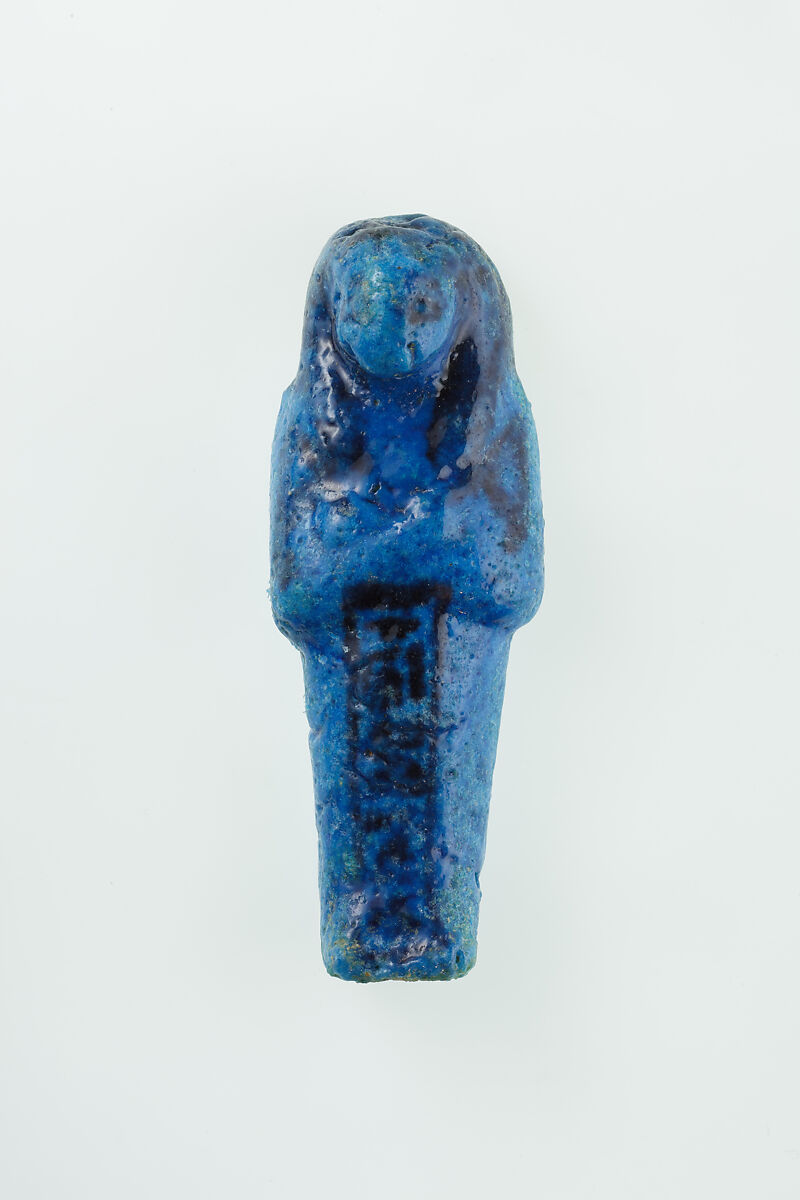 Almost 400 small funerary figures known as shabtis were found with Nauny’s burial. These can be seen as avatars, meant to carry out agricultural labor on Nauny’s behalf in the afterlife. Of the 393 shabtis discovered, 355 were workers like this one, and 37 were overseers (see for example <a href="https://www.metmuseum.org/art/collection/search/551114">30.3.28.3</a>). Based on other assemblages from this era, Nauny originally might have had a total of 365 workers, one for each day of the year. This mummiform figure holds a hoe in each hand and has a basket on its back. The inscription on the front of the body calls Nauny an “illuminated Osiris.” This indicated that she had been transformed through the process of mummification and identified with the principal god of the dead, then reanimated by the light of the sun god as he traveled through the Netherworld each night. Nauny’s shabtis were divided between seven boxes. Five of these, with their shabtis, were given to The Met, while two were sent to the Egyptian Museum in Cairo.
