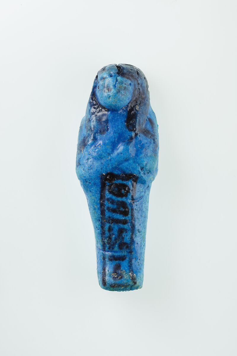 Almost 400 small funerary figures known as shabtis were found with Nauny’s burial. These can be seen as avatars, meant to carry out agricultural labor on Nauny’s behalf in the afterlife. Of the 393 shabtis discovered, 355 were workers like this one, and 37 were overseers (see for example <a href="https://www.metmuseum.org/art/collection/search/551114">30.3.28.3</a>). Based on other assemblages from this era, Nauny originally might have had a total of 365 workers, one for each day of the year. This mummiform figure holds a hoe in each hand and has a basket on its back. The inscription on the front of the body reads, "the Osiris Nauny, true of voice." This indicated that Nauny had been transformed through the process of mummification and identified with the principal god of the dead, and then had been judged to have led an ethical life. Nauny’s shabtis were divided between seven boxes. Five of these, with their shabtis, were given to The Met, while two were sent to the Egyptian Museum in Cairo.