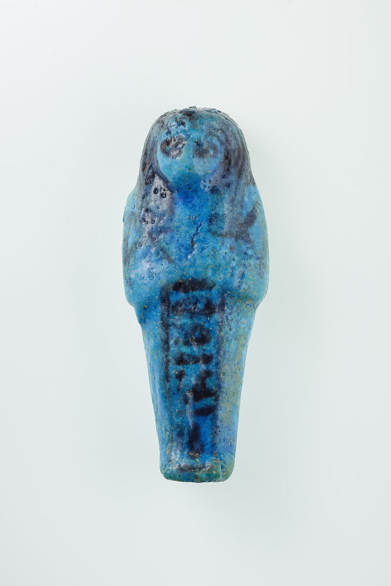Almost 400 small funerary figures known as shabtis were found with Nauny’s burial. These can be seen as avatars, meant to carry out agricultural labor on Nauny’s behalf in the afterlife. Of the 393 shabtis discovered, 355 were workers like this one, and 37 were overseers (see for example <a href="https://www.metmuseum.org/art/collection/search/551114">30.3.28.3</a>). Based on other assemblages from this era, Nauny originally might have had a total of 365 workers, one for each day of the year. This mummiform figure holds a hoe in each hand and has a basket on its back. The inscription on the front of the body reads, "the Osiris Nauny, true of voice." This indicated that Nauny had been transformed through the process of mummification and identified with the principal god of the dead, and then had been judged to have led an ethical life. Nauny’s shabtis were divided between seven boxes. Five of these, with their shabtis, were given to The Met, while two were sent to the Egyptian Museum in Cairo.