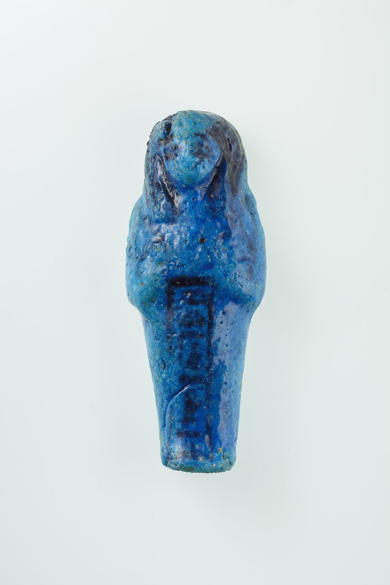 Almost 400 small funerary figures known as shabtis were found with Nauny’s burial. These can be seen as avatars, meant to carry out agricultural labor on Nauny’s behalf in the afterlife. Of the 393 shabtis discovered, 355 were workers like this one, and 37 were overseers (see for example <a href="https://www.metmuseum.org/art/collection/search/551114">30.3.28.3</a>). Based on other assemblages from this era, Nauny originally might have had a total of 365 workers, one for each day of the year. This mummiform figure holds a hoe in each hand and has a basket on its back. The inscription on the front of the body reads, "the Osiris Nauny, true of voice." This indicated that Nauny had been transformed through the process of mummification and identified with the principal god of the dead, and then had been judged to have led an ethical life. Nauny’s shabtis were divided between seven boxes. Five of these, with their shabtis, were given to The Met, while two were sent to the Egyptian Museum in Cairo.