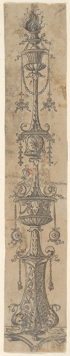 Decorative border panel with flaming candelabra ornamented with foliate designs, swags, and a cow's skull, from Life of the Virgin and Christ