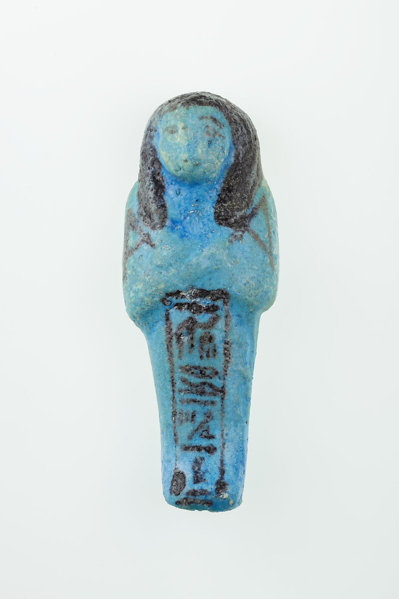 Almost 400 small funerary figures known as shabtis were found with Nauny’s burial. These can be seen as avatars, meant to carry out agricultural labor on Nauny’s behalf in the afterlife. Of the 393 shabtis discovered, 355 were workers like this one, and 37 were overseers (see for example <a href="https://www.metmuseum.org/art/collection/search/551114">30.3.28.3</a>). Based on other assemblages from this era, Nauny originally might have had a total of 365 workers, one for each day of the year. This mummiform figure holds a hoe in each hand and has a basket on its back. The inscription on the front of the body calls Nauny an “illuminated Osiris.” This indicated that she had been transformed through the process of mummification and identified with the principal god of the dead, then reanimated by the light of the sun god as he traveled through the Netherworld each night. Nauny’s shabtis were divided between seven boxes. Five of these, with their shabtis, were given to The Met, while two were sent to the Egyptian Museum in Cairo.