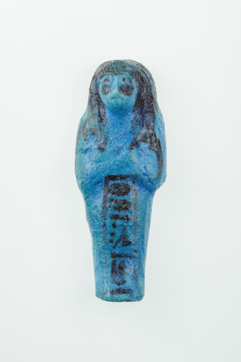 Almost 400 small funerary figures known as shabtis were found with Nauny’s burial. These can be seen as avatars, meant to carry out agricultural labor on Nauny’s behalf in the afterlife. Of the 393 shabtis discovered, 355 were workers like this one, and 37 were overseers (see for example <a href="https://www.metmuseum.org/art/collection/search/551114">30.3.28.3</a>). Based on other assemblages from this era, Nauny originally might have had a total of 365 workers, one for each day of the year. This mummiform figure holds a hoe in each hand and has a basket on its back. The inscription on the front of the body calls Nauny an “illuminated Osiris.” This indicated that she had been transformed through the process of mummification and identified with the principal god of the dead, then reanimated by the light of the sun god as he traveled through the Netherworld each night. Nauny’s shabtis were divided between seven boxes. Five of these, with their shabtis, were given to The Met, while two were sent to the Egyptian Museum in Cairo.