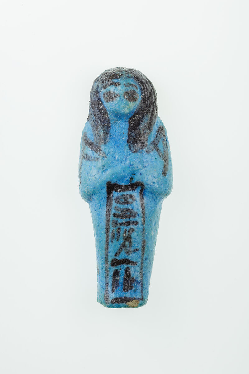 Almost 400 small funerary figures known as shabtis were found with Nauny’s burial. These can be seen as avatars, meant to carry out agricultural labor on Nauny’s behalf in the afterlife. Of the 393 shabtis discovered, 355 were workers like this one, and 37 were overseers (see for example <a href="https://www.metmuseum.org/art/collection/search/551114">30.3.28.3</a>). Based on other assemblages from this era, Nauny originally might have had a total of 365 workers, one for each day of the year. This mummiform figure holds a hoe in each hand and has a basket on its back. The inscription on the front of the body calls Nauny an “illuminated Osiris.” This indicated that she had been transformed through the process of mummification and identified with the principal god of the dead, then reanimated by the light of the sun god as he traveled through the Netherworld each night. Nauny’s shabtis were divided between seven boxes. Five of these, with their shabtis, were given to The Met, while two were sent to the Egyptian Museum in Cairo.