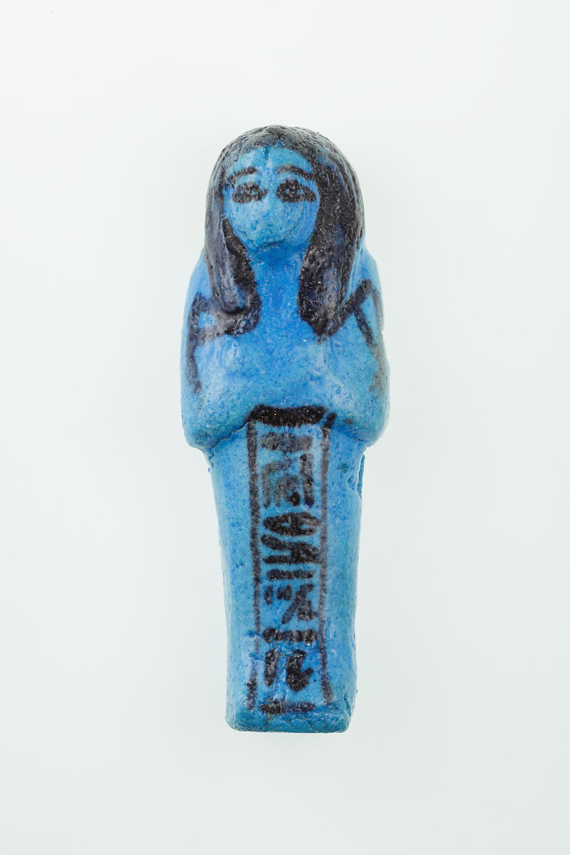 Almost 400 small funerary figures known as shabtis were found with Nauny’s burial. These can be seen as avatars, meant to carry out agricultural labor on Nauny’s behalf in the afterlife. Of the 393 shabtis discovered, 355 were workers like this one, and 37 were overseers (see for example <a href="https://www.metmuseum.org/art/collection/search/551114">30.3.28.3</a>). Based on other assemblages from this era, Nauny originally might have had a total of 365 workers, one for each day of the year. This mummiform figure holds a hoe in each hand and has a basket on its back. The inscription on the front of the body calls Nauny an “illuminated Osiris.” This indicated that she had been transformed through the process of mummification and identified with the principal god of the dead, then reanimated by the light of the sun god as he traveled through the Netherworld each night. Nauny’s shabtis were divided between seven boxes. Five of these, with their shabtis, were given to The Met, while two were sent to the Egyptian Museum in Cairo.