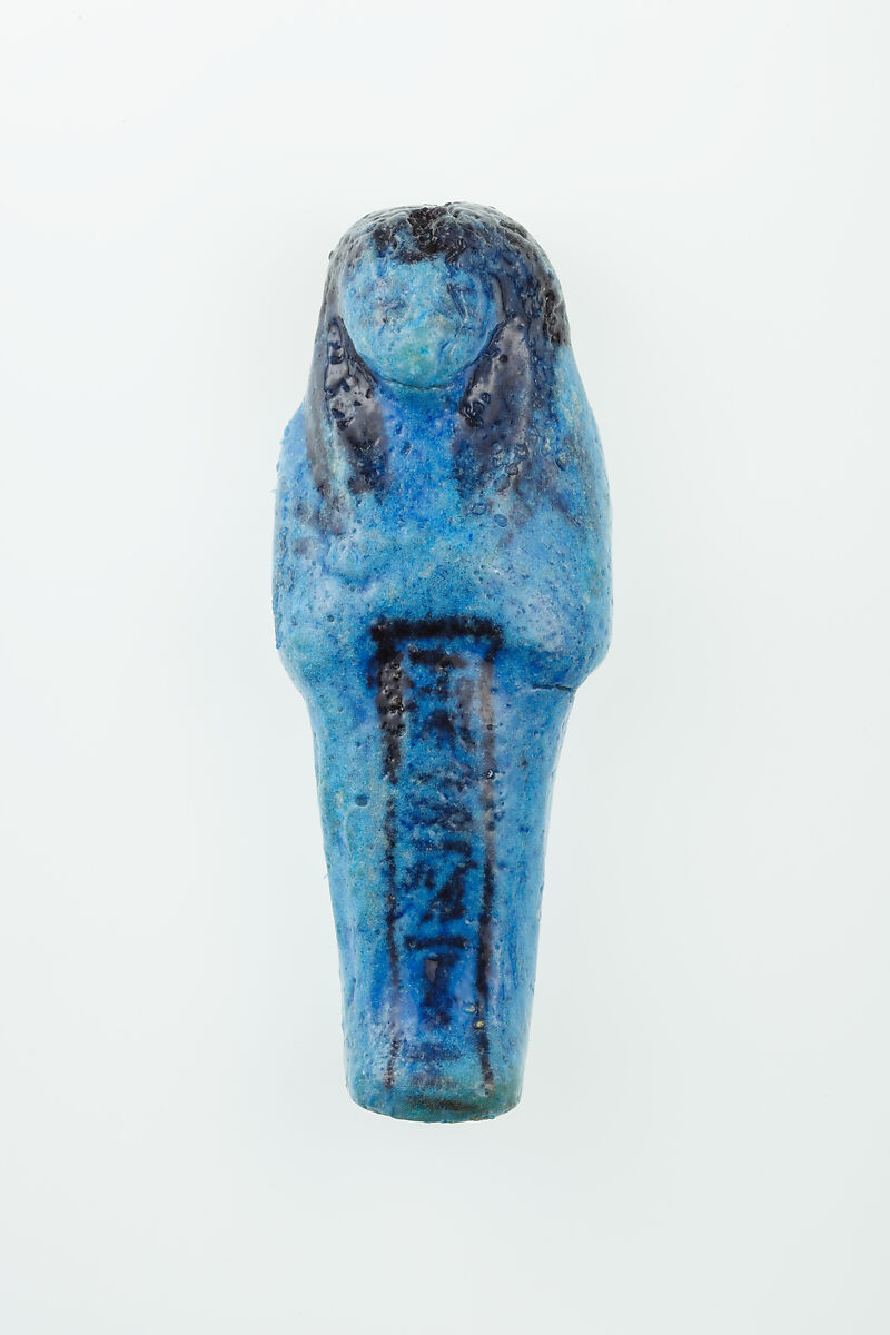 Almost 400 small funerary figures known as shabtis were found with Nauny’s burial. These can be seen as avatars, meant to carry out agricultural labor on Nauny’s behalf in the afterlife. Of the 393 shabtis discovered, 355 were workers like this one, and 37 were overseers (see for example <a href="https://www.metmuseum.org/art/collection/search/551114">30.3.28.3</a>). Based on other assemblages from this era, Nauny originally might have had a total of 365 workers, one for each day of the year. This mummiform figure holds a hoe in each hand and has a basket on its back. The inscription on the front of the body calls Nauny an “illuminated Osiris.” This indicated that she had been transformed through the process of mummification and identified with the principal god of the dead, then reanimated by the light of the sun god as he traveled through the Netherworld each night. Nauny’s shabtis were divided between seven boxes. Five of these, with their shabtis, were given to The Met, while two were sent to the Egyptian Museum in Cairo.