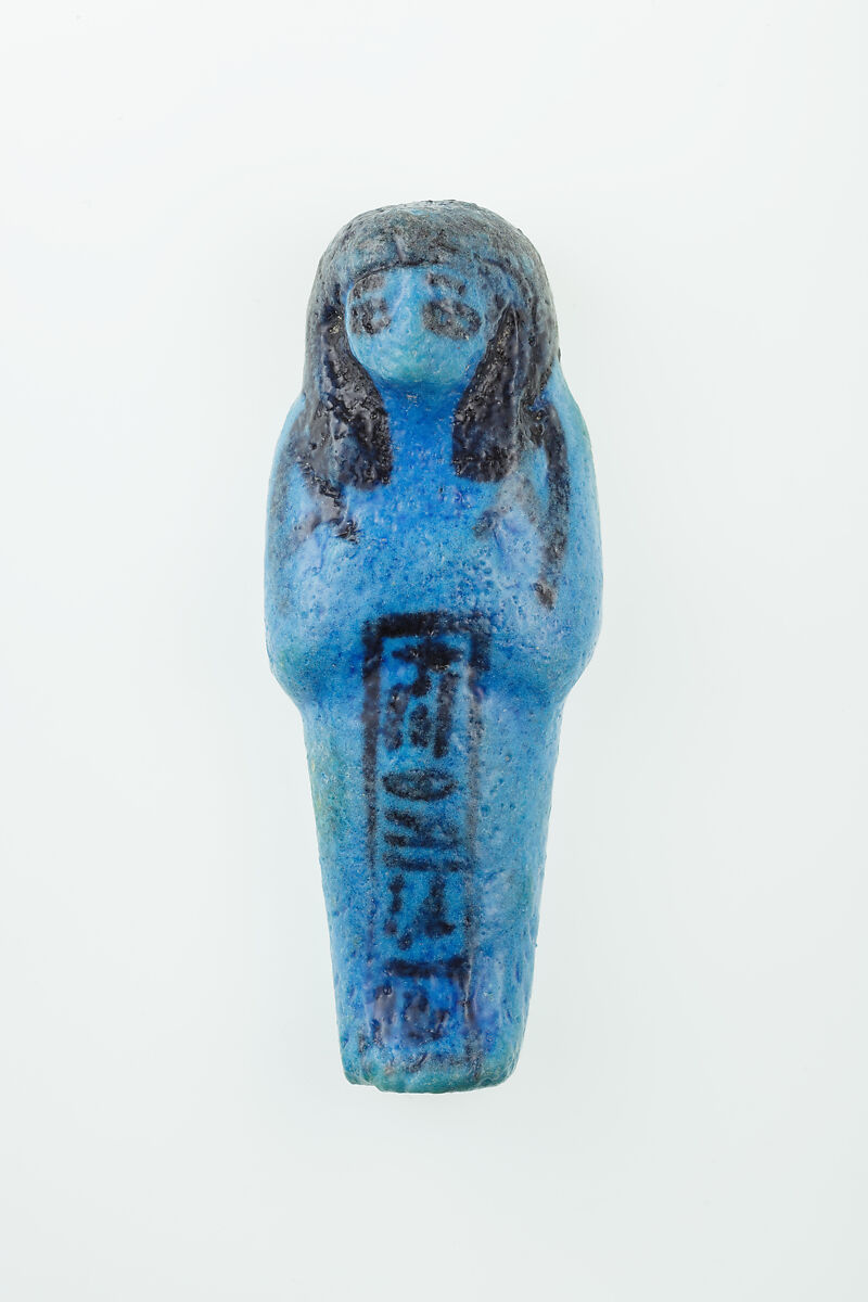 Almost 400 small funerary figures known as shabtis were found with Nauny’s burial. These can be seen as avatars, meant to carry out agricultural labor on Nauny’s behalf in the afterlife. Of the 393 shabtis discovered, 355 were workers like this one, and 37 were overseers (see for example <a href="https://www.metmuseum.org/art/collection/search/551114">30.3.28.3</a>). Based on other assemblages from this era, Nauny originally might have had a total of 365 workers, one for each day of the year. This mummiform figure holds a hoe in each hand and has a basket on its back. The inscription on the front of the body calls Nauny an “illuminated Osiris.” This indicated that she had been transformed through the process of mummification and identified with the principal god of the dead, then reanimated by the light of the sun god as he traveled through the Netherworld each night. Nauny’s shabtis were divided between seven boxes. Five of these, with their shabtis, were given to The Met, while two were sent to the Egyptian Museum in Cairo.