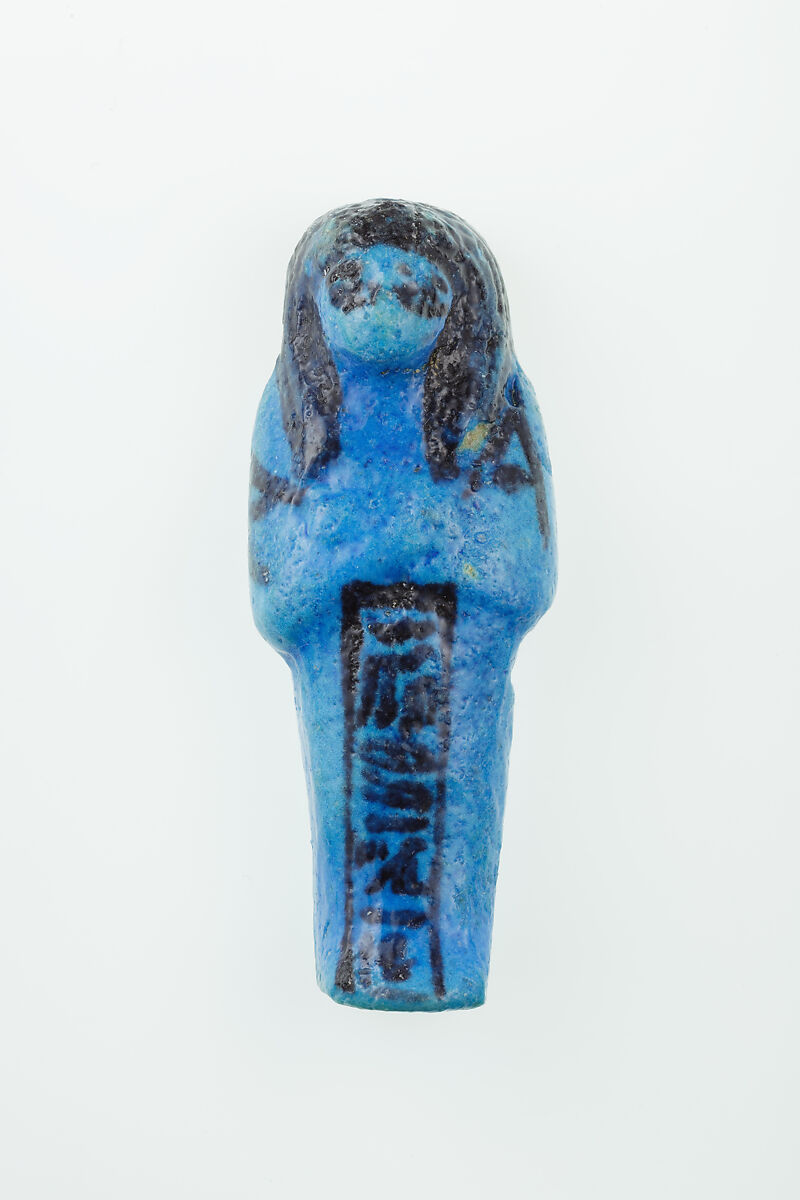 Almost 400 small funerary figures known as shabtis were found with Nauny’s burial. These can be seen as avatars, meant to carry out agricultural labor on Nauny’s behalf in the afterlife. Of the 393 shabtis discovered, 355 were workers like this one, and 37 were overseers (see for example <a href="https://www.metmuseum.org/art/collection/search/551114">30.3.28.3</a>). Based on other assemblages from this era, Nauny originally might have had a total of 365 workers, one for each day of the year. This mummiform figure holds a hoe in each hand and has a basket on its back. The inscription on the front of the body reads, "the Osiris Nauny, true of voice." This indicated that Nauny had been transformed through the process of mummification and identified with the principal god of the dead, and then had been judged to have led an ethical life. Nauny’s shabtis were divided between seven boxes. Five of these, with their shabtis, were given to The Met, while two were sent to the Egyptian Museum in Cairo.