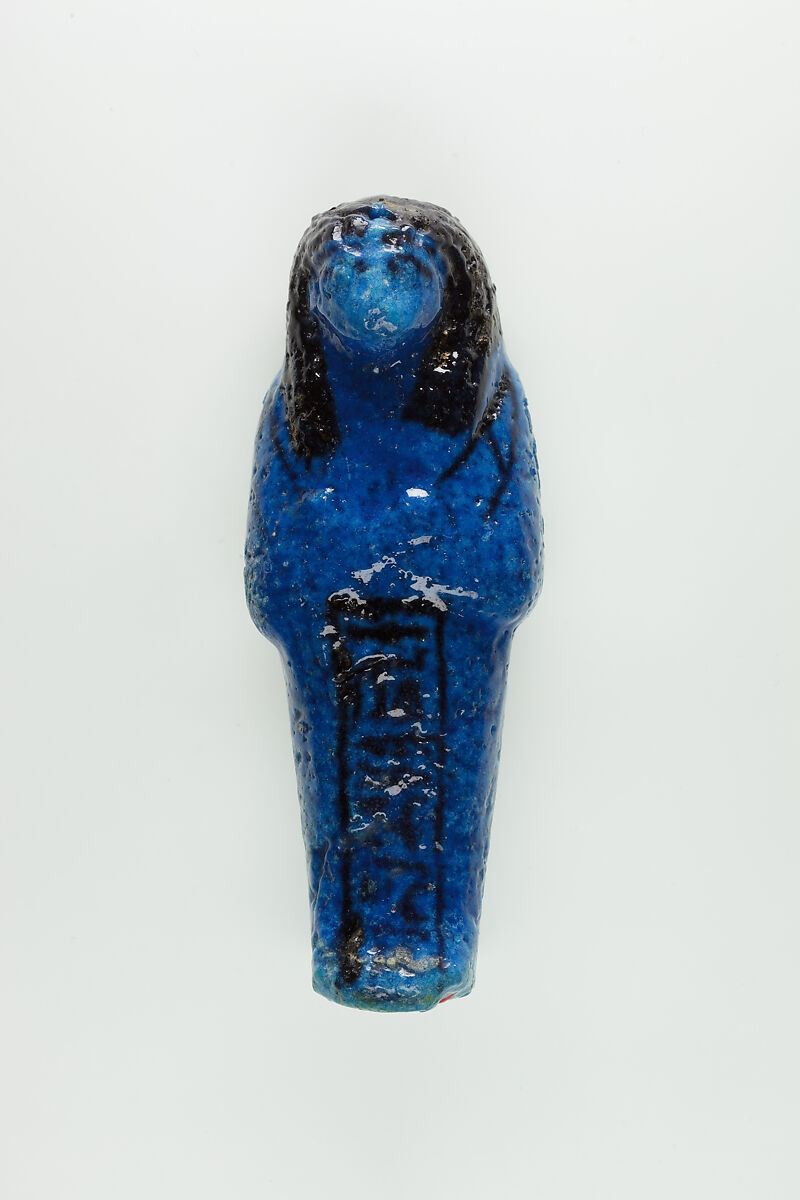 Almost 400 small funerary figures known as shabtis were found with Nauny’s burial. These can be seen as avatars, meant to carry out agricultural labor on Nauny’s behalf in the afterlife. Of the 393 shabtis discovered, 355 were workers like this one, and 37 were overseers (see for example <a href="https://www.metmuseum.org/art/collection/search/551114">30.3.28.3</a>). Based on other assemblages from this era, Nauny originally might have had a total of 365 workers, one for each day of the year. This mummiform figure holds a hoe in each hand and has a basket on its back. The inscription on the front of the body calls Nauny a King’s Daughter, and an “illuminated Osiris.” This indicated that she had been transformed through the process of mummification and identified with the principal god of the dead, then reanimated by the light of the sun god as he traveled through the Netherworld each night. Nauny’s shabtis were divided between seven boxes. Five of these, with their shabtis, were given to The Met, while two were sent to the Egyptian Museum in Cairo.