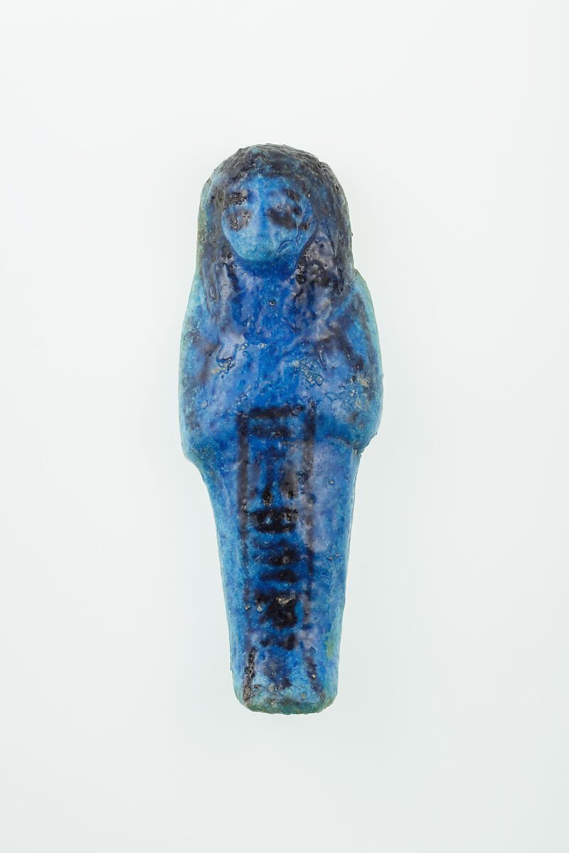 Almost 400 small funerary figures known as shabtis were found with Nauny’s burial. These can be seen as avatars, meant to carry out agricultural labor on Nauny’s behalf in the afterlife. Of the 393 shabtis discovered, 355 were workers like this one, and 37 were overseers (see for example <a href="https://www.metmuseum.org/art/collection/search/551114">30.3.28.3</a>). Based on other assemblages from this era, Nauny originally might have had a total of 365 workers, one for each day of the year. This mummiform figure holds a hoe in each hand and has a basket on its back. The inscription on the front of the body calls Nauny an “illuminated Osiris.” This indicated that she had been transformed through the process of mummification and identified with the principal god of the dead, then reanimated by the light of the sun god as he traveled through the Netherworld each night. Nauny’s shabtis were divided between seven boxes. Five of these, with their shabtis, were given to The Met, while two were sent to the Egyptian Museum in Cairo.