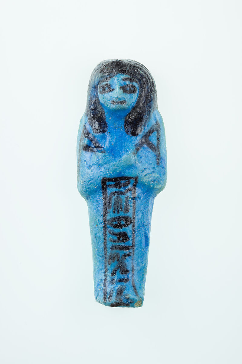 Almost 400 small funerary figures known as shabtis were found with Nauny’s burial. These can be seen as avatars, meant to carry out agricultural labor on Nauny’s behalf in the afterlife. Of the 393 shabtis discovered, 355 were workers like this one, and 37 were overseers (see for example <a href="https://www.metmuseum.org/art/collection/search/551114">30.3.28.3</a>). Based on other assemblages from this era, Nauny originally might have had a total of 365 workers, one for each day of the year. This mummiform figure holds a hoe in each hand and has a basket on its back. The inscription on the front of the body calls Nauny an “illuminated Osiris.” This indicated that she had been transformed through the process of mummification and identified with the principal god of the dead, then reanimated by the light of the sun god as he traveled through the Netherworld each night. Nauny’s shabtis were divided between seven boxes. Five of these, with their shabtis, were given to The Met, while two were sent to the Egyptian Museum in Cairo.
