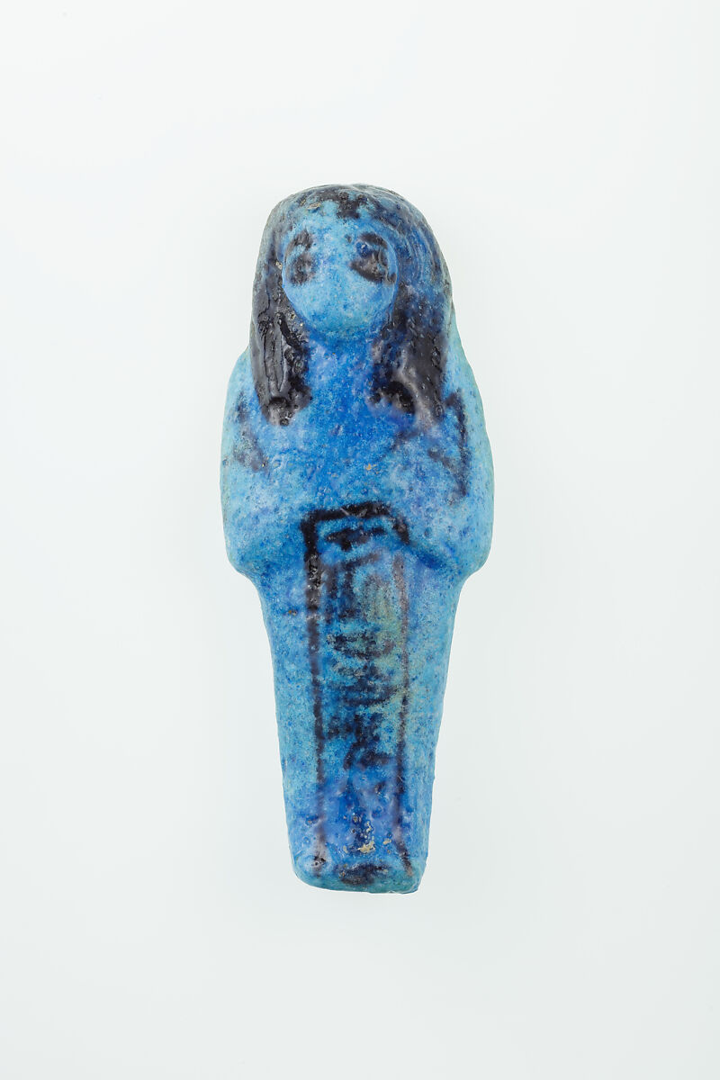 Almost 400 small funerary figures known as shabtis were found with Nauny’s burial. These can be seen as avatars, meant to carry out agricultural labor on Nauny’s behalf in the afterlife. Of the 393 shabtis discovered, 355 were workers like this one, and 37 were overseers (see for example <a href="https://www.metmuseum.org/art/collection/search/551114">30.3.28.3</a>). Based on other assemblages from this era, Nauny originally might have had a total of 365 workers, one for each day of the year. This mummiform figure holds a hoe in each hand and has a basket on its back. The inscription on the front of the body calls Nauny an “illuminated Osiris.” This indicated that she had been transformed through the process of mummification and identified with the principal god of the dead, then reanimated by the light of the sun god as he traveled through the Netherworld each night. Nauny’s shabtis were divided between seven boxes. Five of these, with their shabtis, were given to The Met, while two were sent to the Egyptian Museum in Cairo.