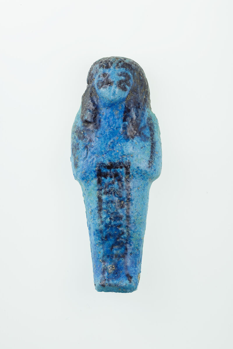 Almost 400 small funerary figures known as shabtis were found with Nauny’s burial. These can be seen as avatars, meant to carry out agricultural labor on Nauny’s behalf in the afterlife. Of the 393 shabtis discovered, 355 were workers like this one, and 37 were overseers (see for example <a href="https://www.metmuseum.org/art/collection/search/551114">30.3.28.3</a>). Based on other assemblages from this era, Nauny originally might have had a total of 365 workers, one for each day of the year. This mummiform figure holds a hoe in each hand and has a basket on its back. The inscription on the front of the body calls Nauny an “illuminated Osiris.” This indicated that she had been transformed through the process of mummification and identified with the principal god of the dead, then reanimated by the light of the sun god as he traveled through the Netherworld each night. Nauny’s shabtis were divided between seven boxes. Five of these, with their shabtis, were given to The Met, while two were sent to the Egyptian Museum in Cairo.