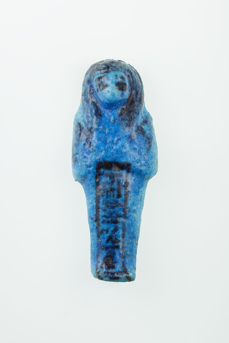 Almost 400 small funerary figures known as shabtis were found with Nauny’s burial. These can be seen as avatars, meant to carry out agricultural labor on Nauny’s behalf in the afterlife. Of the 393 shabtis discovered, 355 were workers like this one, and 37 were overseers (see for example <a href="https://www.metmuseum.org/art/collection/search/551114">30.3.28.3</a>). Based on other assemblages from this era, Nauny originally might have had a total of 365 workers, one for each day of the year. This mummiform figure holds a hoe in each hand and has a basket on its back. The inscription on the front of the body calls Nauny an “illuminated Osiris.” This indicated that she had been transformed through the process of mummification and identified with the principal god of the dead, then reanimated by the light of the sun god as he traveled through the Netherworld each night. Nauny’s shabtis were divided between seven boxes. Five of these, with their shabtis, were given to The Met, while two were sent to the Egyptian Museum in Cairo.