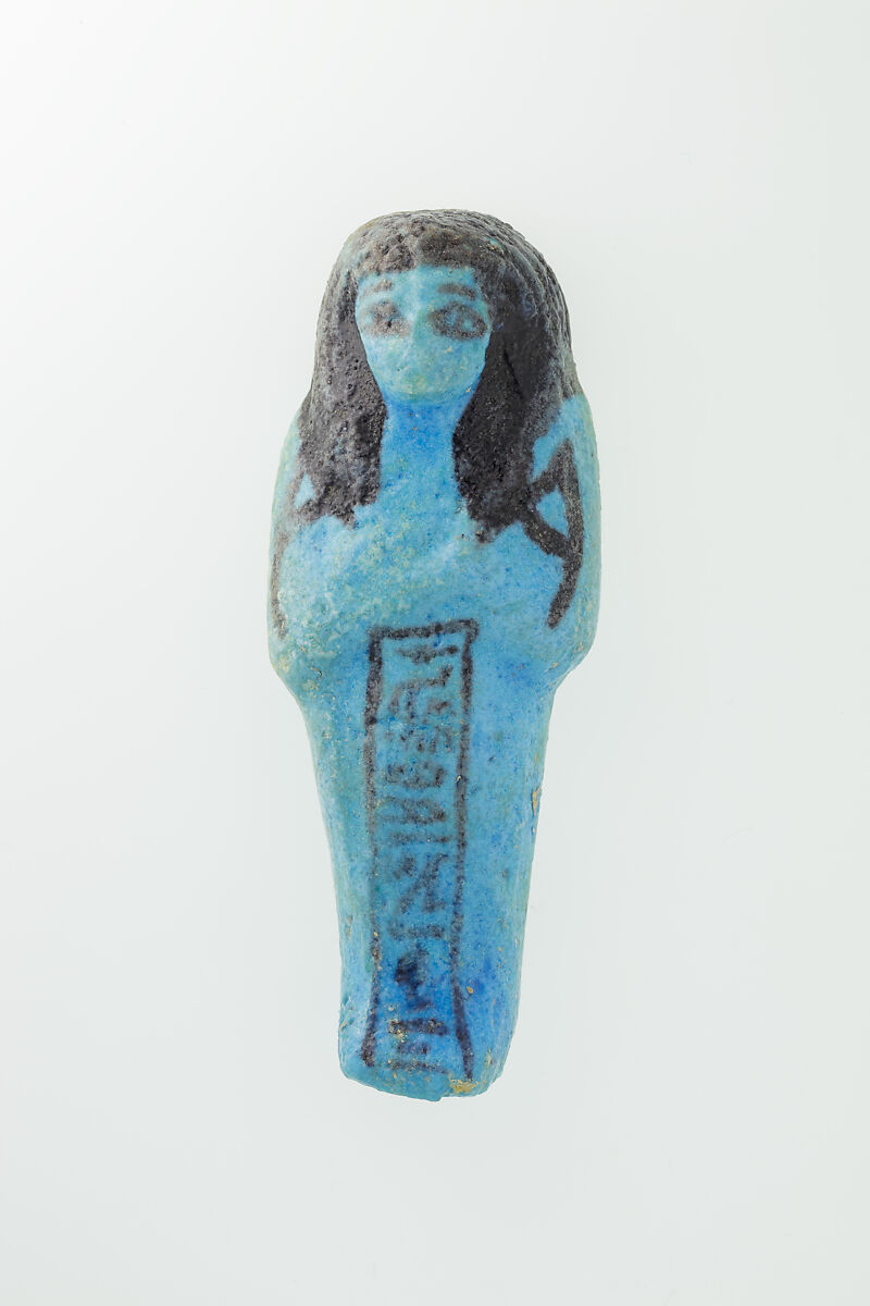 Almost 400 small funerary figures known as shabtis were found with Nauny’s burial. These can be seen as avatars, meant to carry out agricultural labor on Nauny’s behalf in the afterlife. Of the 393 shabtis discovered, 355 were workers like this one, and 37 were overseers (see for example <a href="https://www.metmuseum.org/art/collection/search/551114">30.3.28.3</a>). Based on other assemblages from this era, Nauny originally might have had a total of 365 workers, one for each day of the year. This mummiform figure holds a hoe in each hand and has a basket on its back. The inscription on the front of the body calls Nauny an “illuminated Osiris.” This indicated that she had been transformed through the process of mummification and identified with the principal god of the dead, then reanimated by the light of the sun god as he traveled through the Netherworld each night. Nauny’s shabtis were divided between seven boxes. Five of these, with their shabtis, were given to The Met, while two were sent to the Egyptian Museum in Cairo.