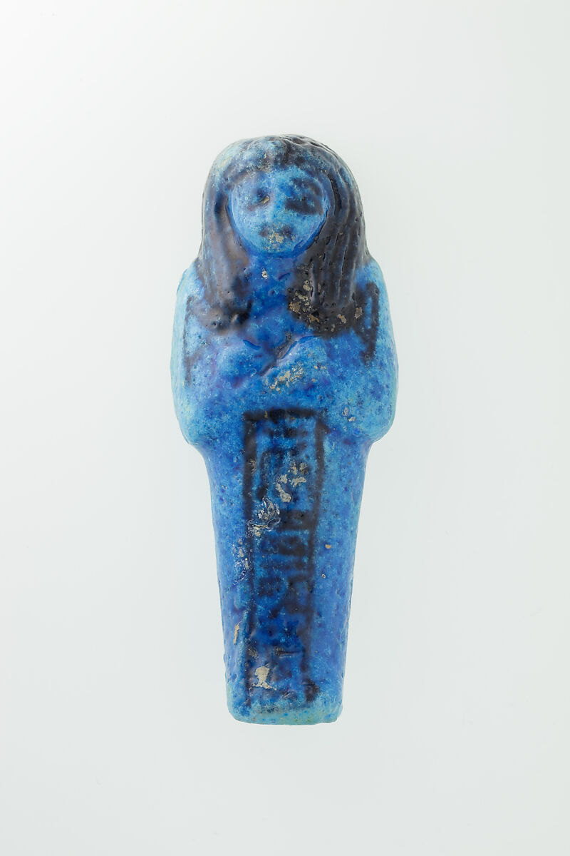 Almost 400 small funerary figures known as shabtis were found with Nauny’s burial. These can be seen as avatars, meant to carry out agricultural labor on Nauny’s behalf in the afterlife. Of the 393 shabtis discovered, 355 were workers like this one, and 37 were overseers (see for example <a href="https://www.metmuseum.org/art/collection/search/551114">30.3.28.3</a>). Based on other assemblages from this era, Nauny originally might have had a total of 365 workers, one for each day of the year. This mummiform figure holds a hoe in each hand and has a basket on its back. The inscription on the front of the body calls Nauny an “illuminated Osiris.” This indicated that she had been transformed through the process of mummification and identified with the principal god of the dead, then reanimated by the light of the sun god as he traveled through the Netherworld each night. Nauny’s shabtis were divided between seven boxes. Five of these, with their shabtis, were given to The Met, while two were sent to the Egyptian Museum in Cairo.